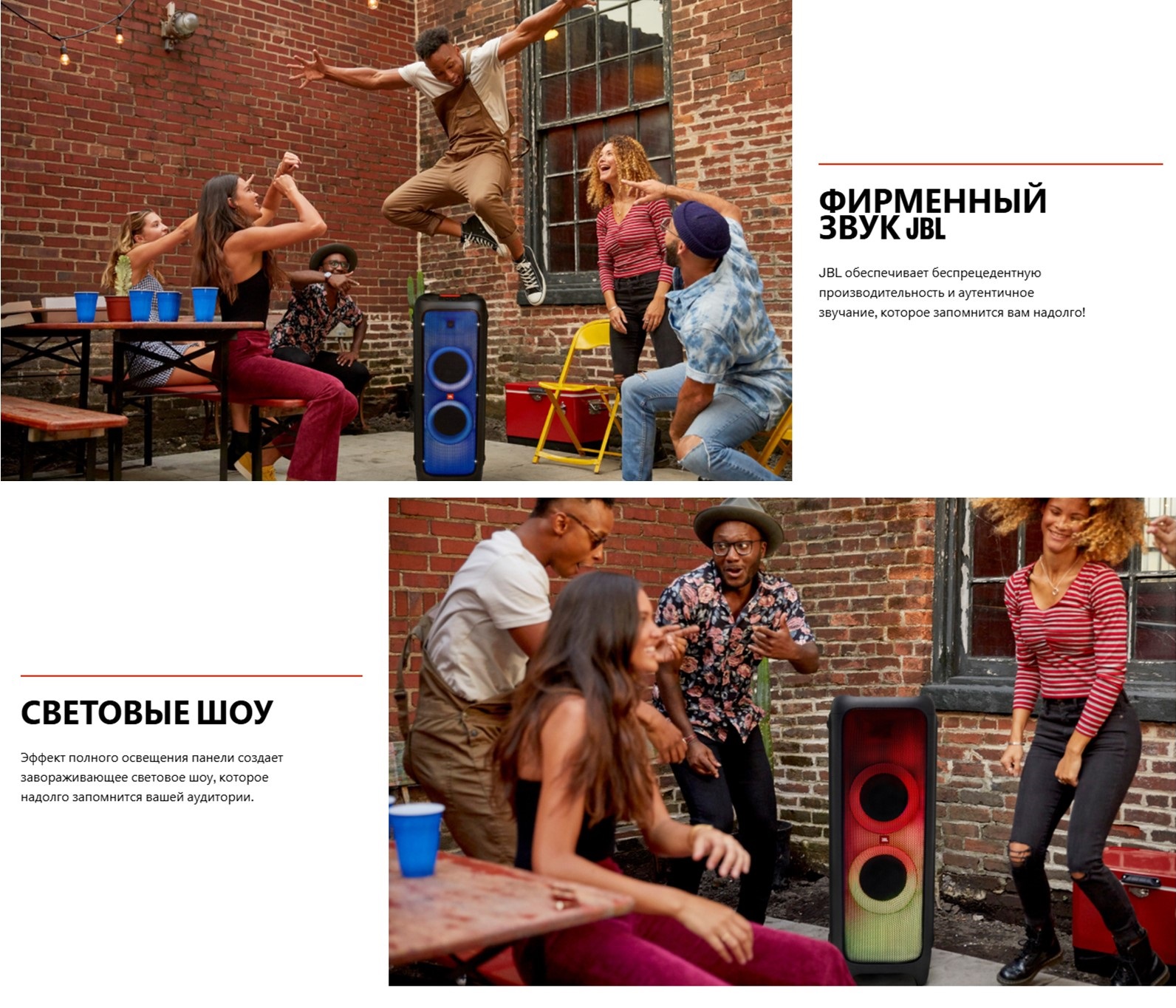 JBL PartyBox 1000 — это мощная акустическая система для вечеринок с качеством звука JBL и захватывающим световым шоу на всей панели. Просто подключите микрофон или гитару и выходите на сцену или транслируйте свой плейлист через Bluetooth или с USB-накопителя. Светодиодный диджей и группа Party Band превратят вашу вечеринку в концерт! Подключите две колонки PartyBox по беспроводной сети с помощью функции TWS или по проводу, соединив один выход RCA с другим входом RCA. Начинаем вечеринку!
