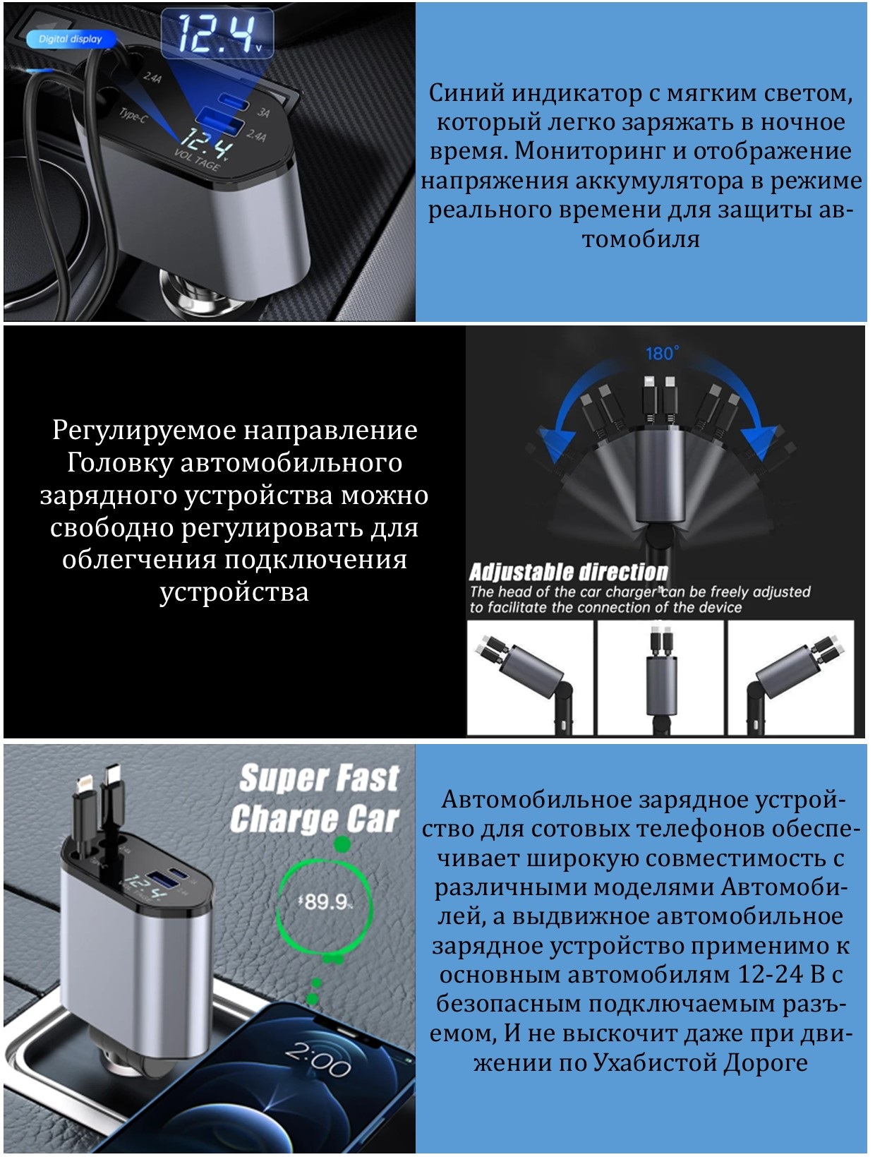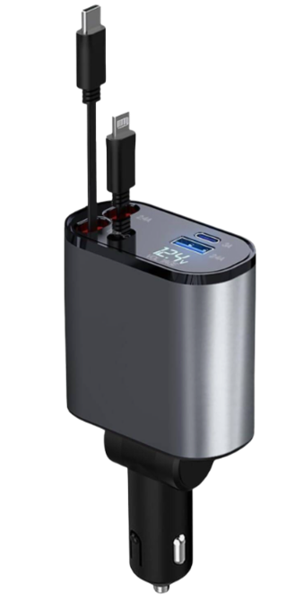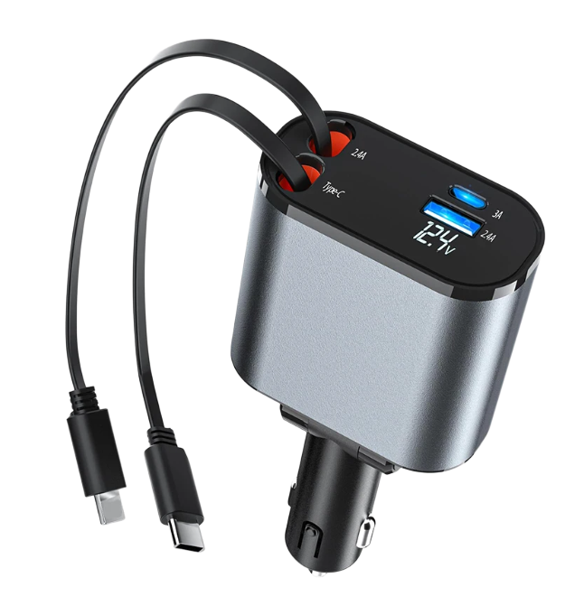Выдвижное автомобильное зарядное устройство для телефона 4 в 1, 120 Вт (интерфейсы Type-C, iOS, USB-C и USB)