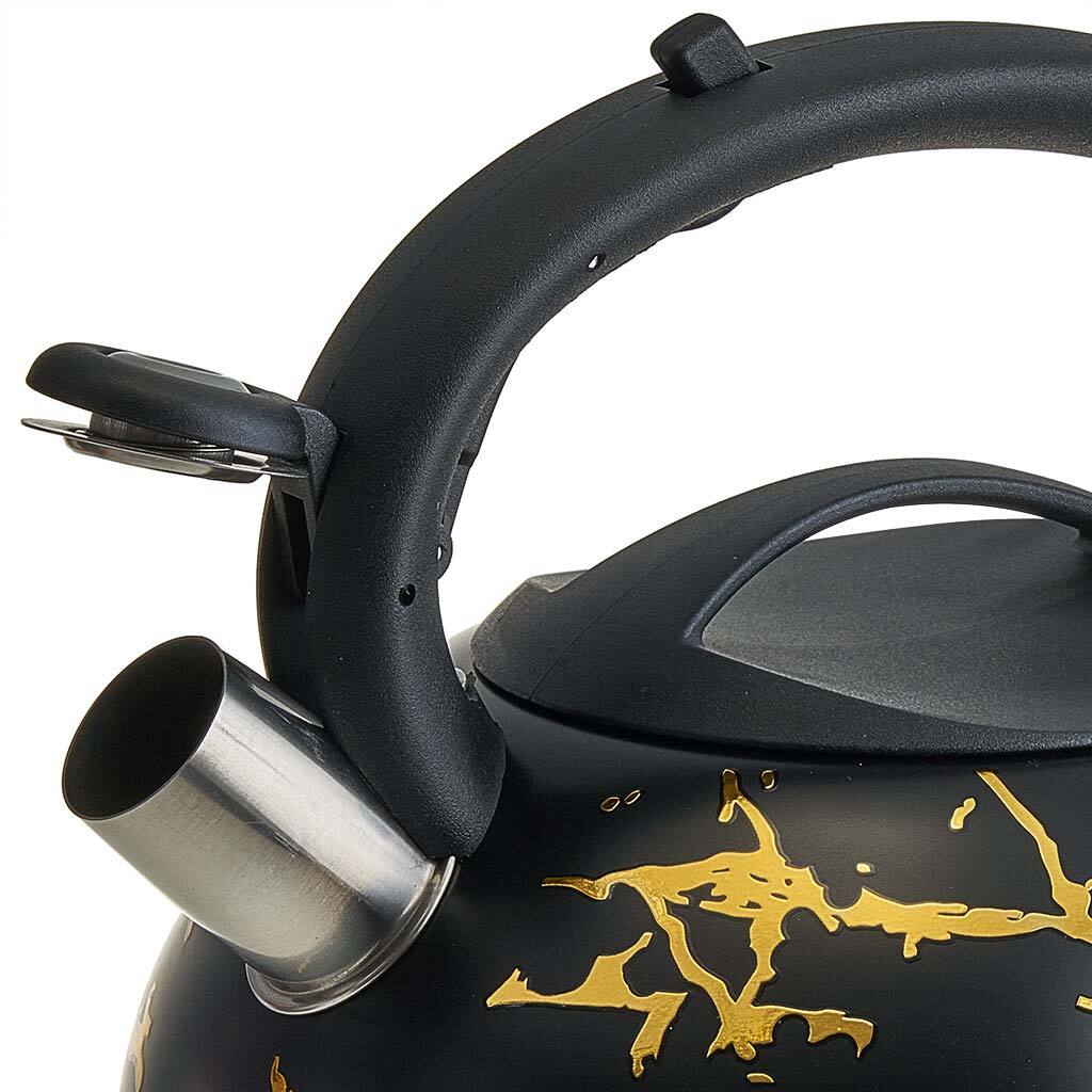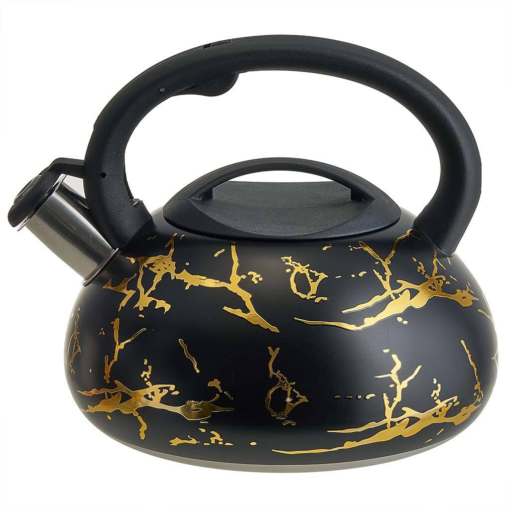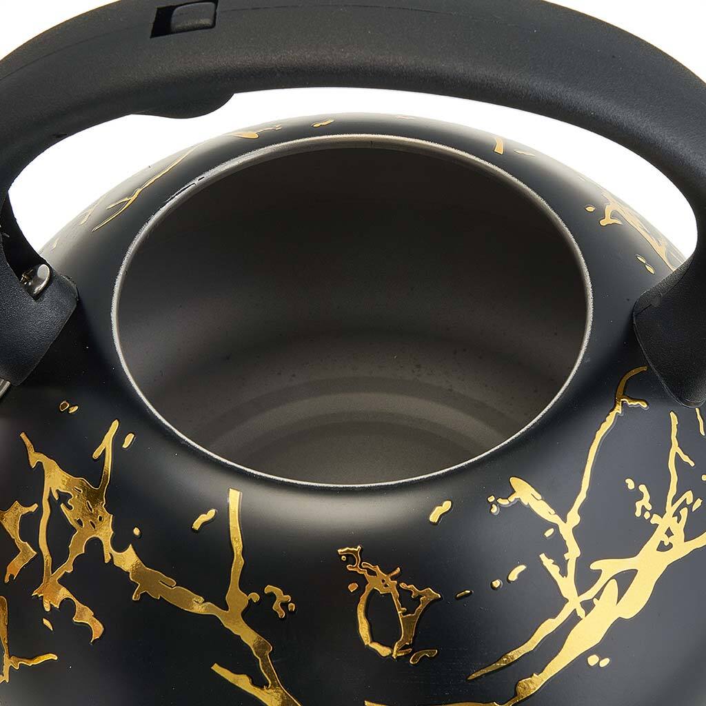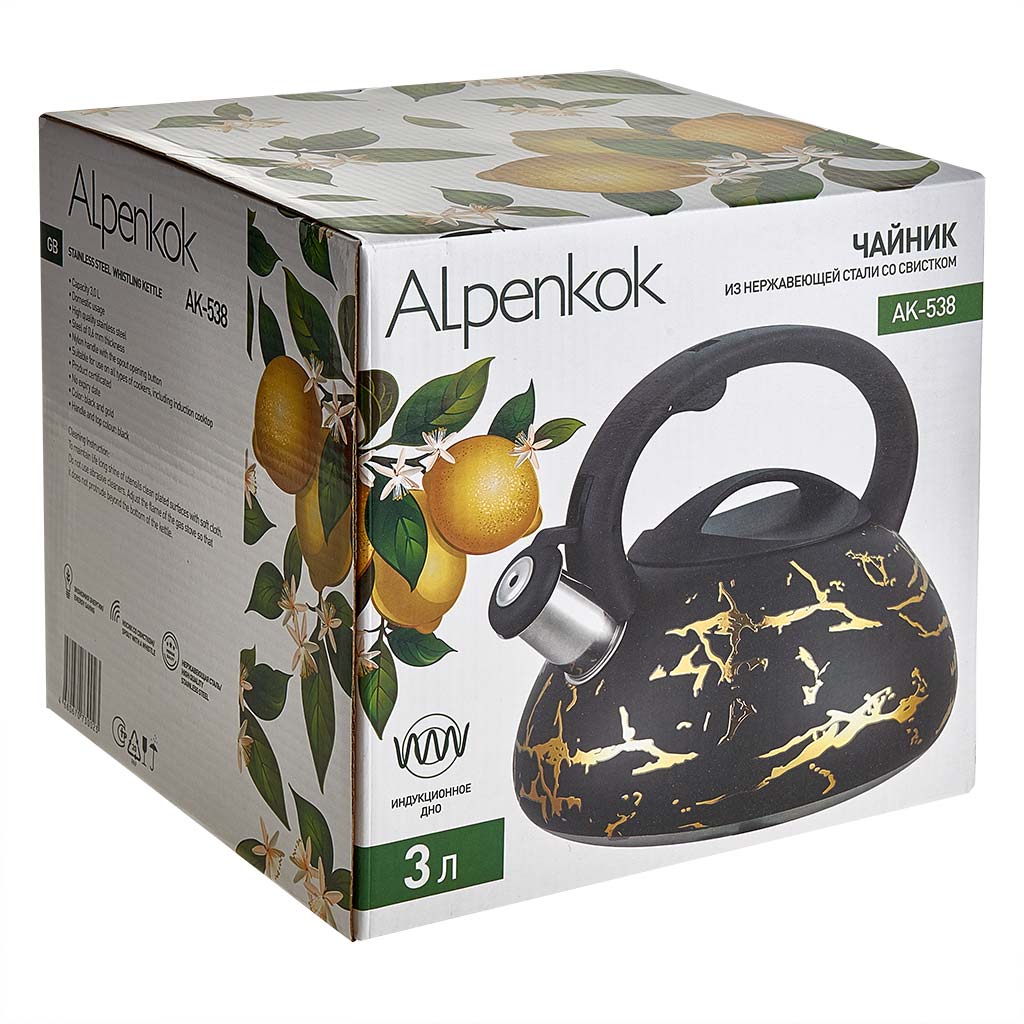Чайник 3 л из нержавеющей стали со свистком, индукционное дно ALPENKOK AK-538 черный с золотом, ручка черный