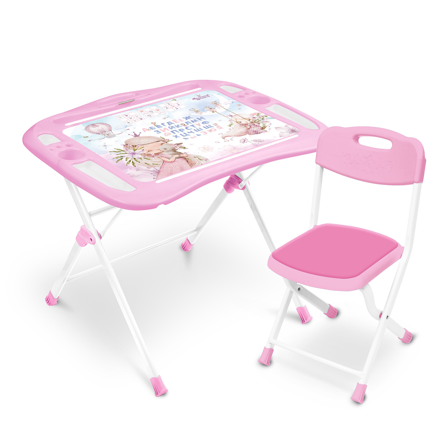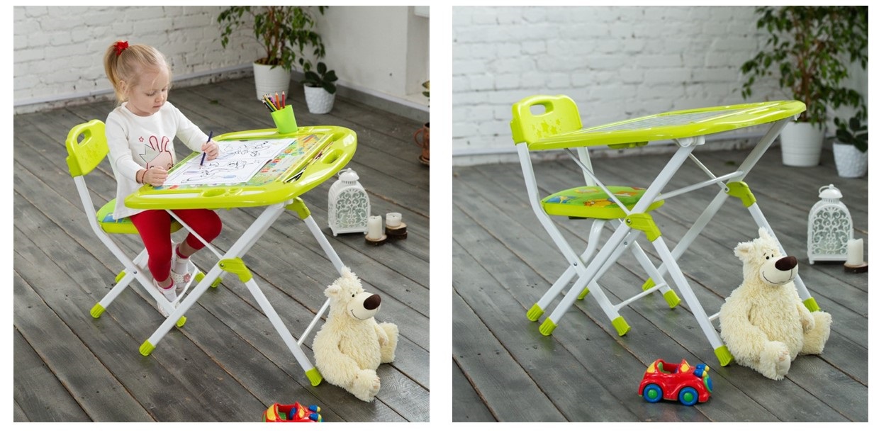 Комплект складной мебели, состоящий  из стула и стола с регулируемым углом наклона столешницы. Для детей в возрасте от 3 до 7 лет.
