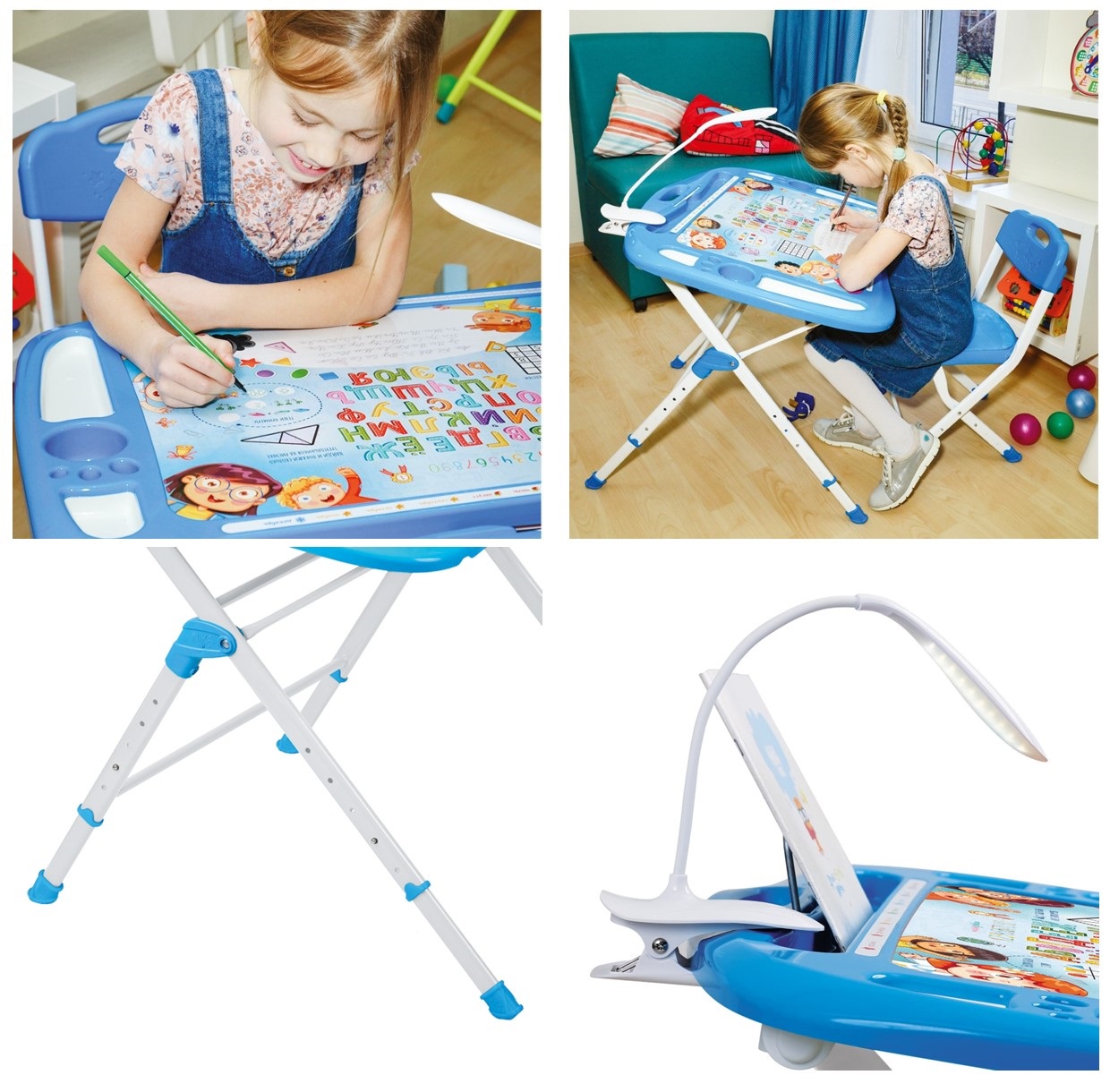 Комплект "растущей" мебели, состоящий из стола, стула и лампы-светильника. Для детей в возрасте от 3 до 12 лет.