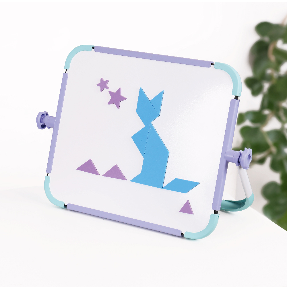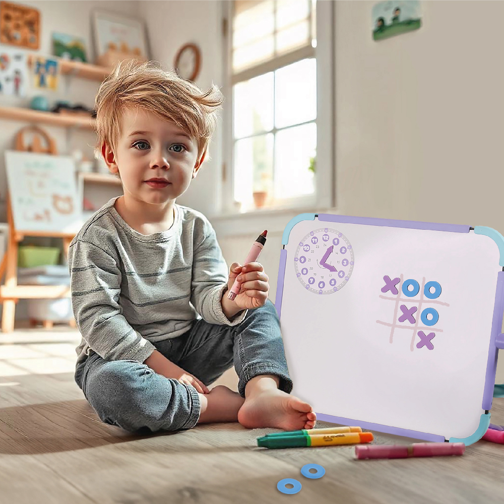 • В комплекте: мелки, держатель для мелков, мягкая мозаика из геометрических фигур типа "Танграм", набор для игры в крестики-нолики, часы