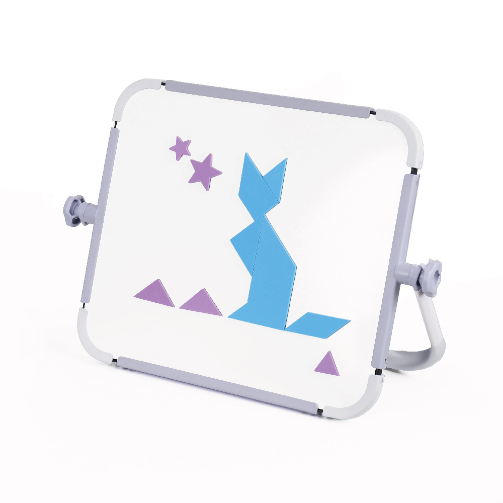 • В комплекте: мелки, держатель для мелков, мягкая мозаика из геометрических фигур типа "Танграм", набор для игры в крестики-нолики, часы