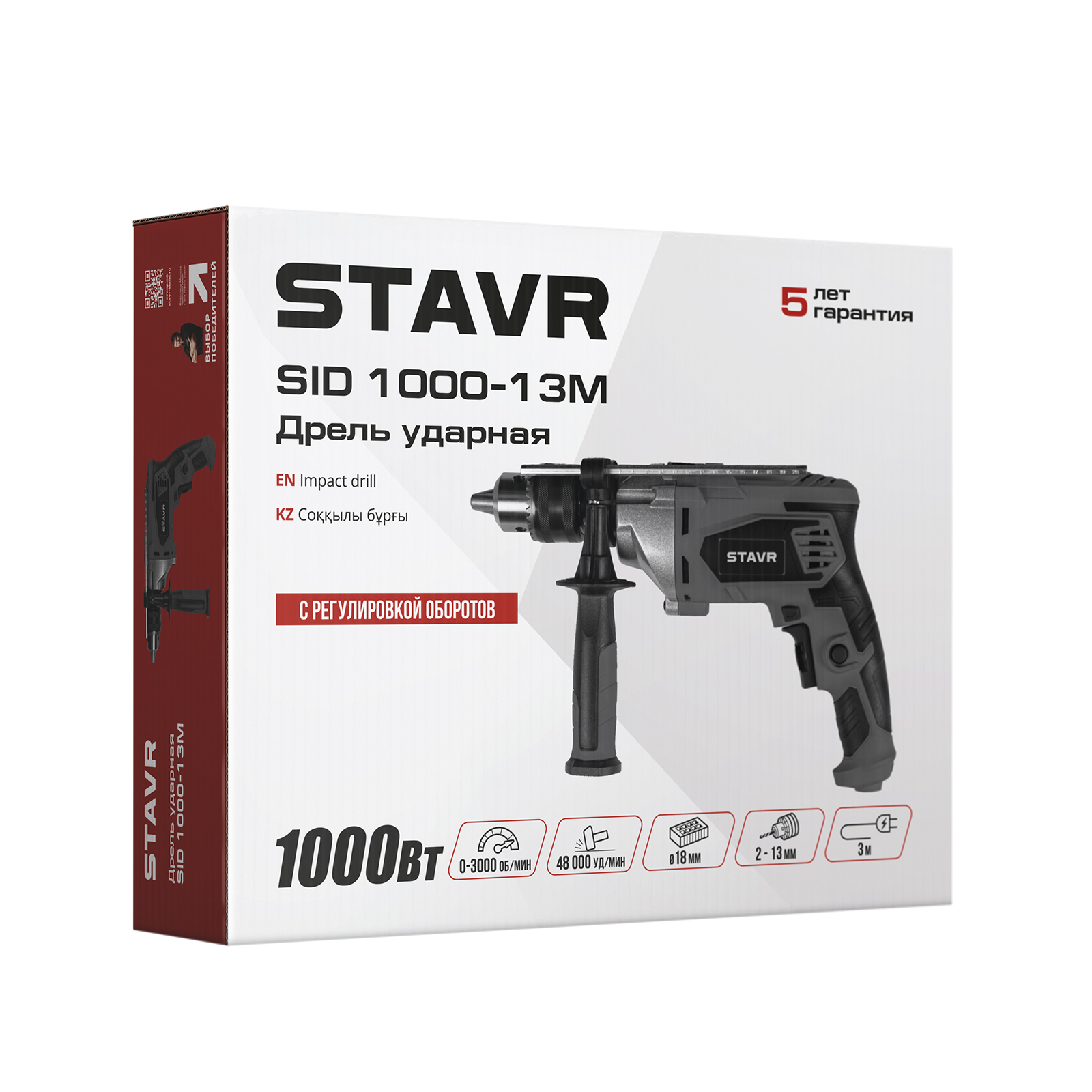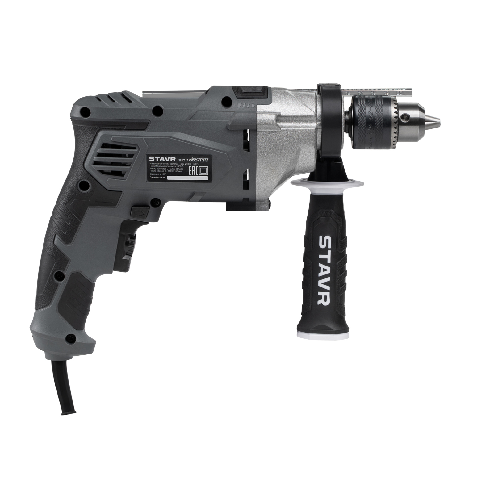 КОМПЛЕКТАЦИЯ: дрель ударная, боковая рукоятка, ограничитель глубины, ключ для патрона, руководство по эксплуатации.