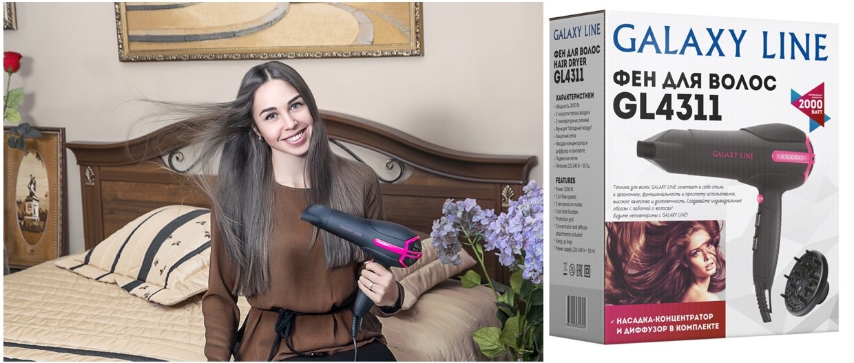 Мощный фен для волос GALAXY LINE GL4311 дает возможность регулировать температурные режимы и скорость воздушного потока,