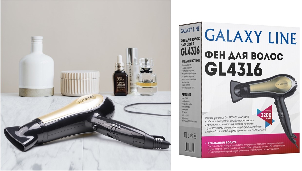 Мощный фен для волос GALAXY LINE GL4316 дает возможность регулировать температурные режимы и скорость воздушного потока.