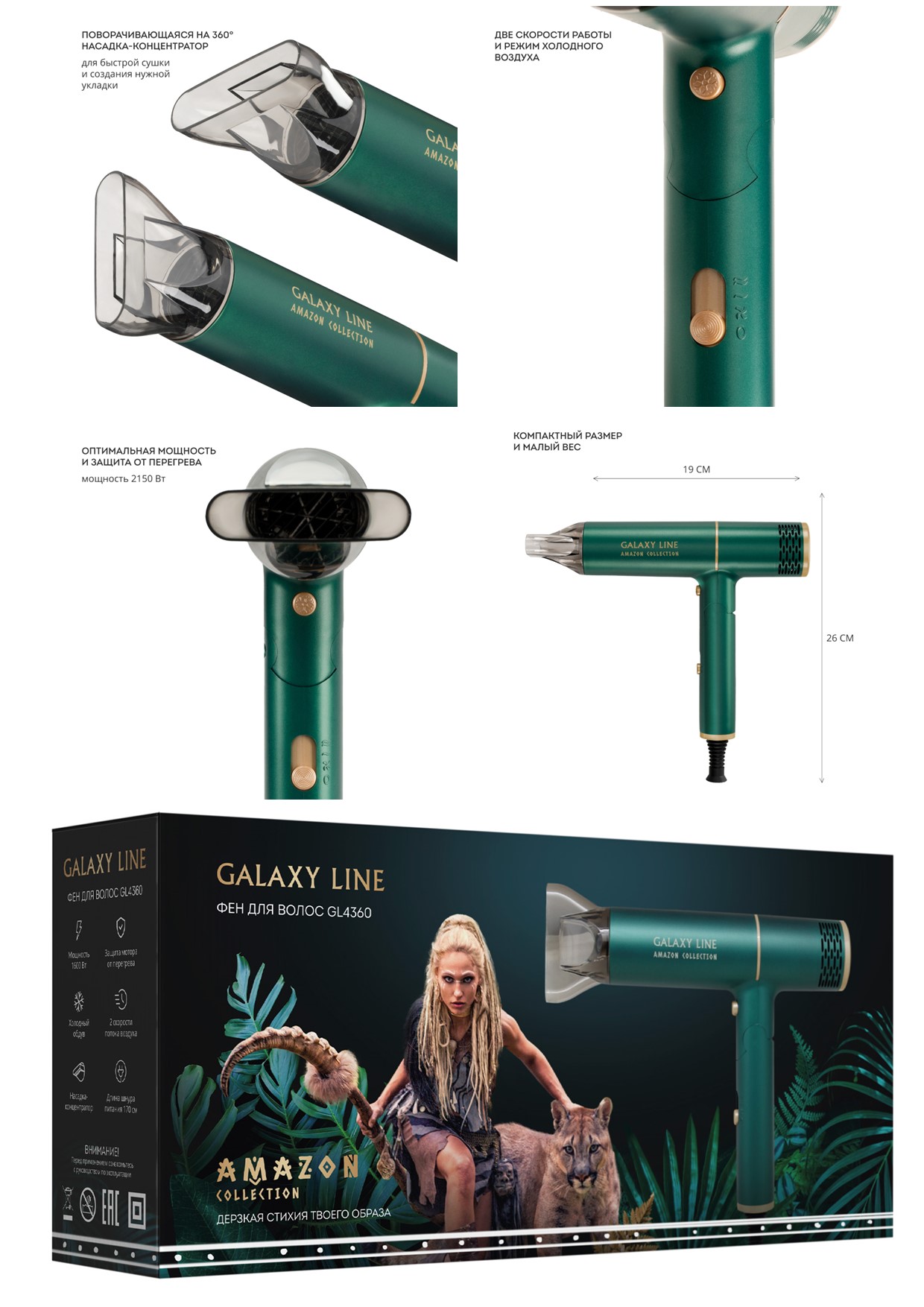 Компактный фен GL4360 из линейки AMAZON COLLECTION представляет собой идеальное сочетание стильного дизайна, удобства и высокой функциональности для безопасной сушки и укладки волос как дома, так и в поездках.