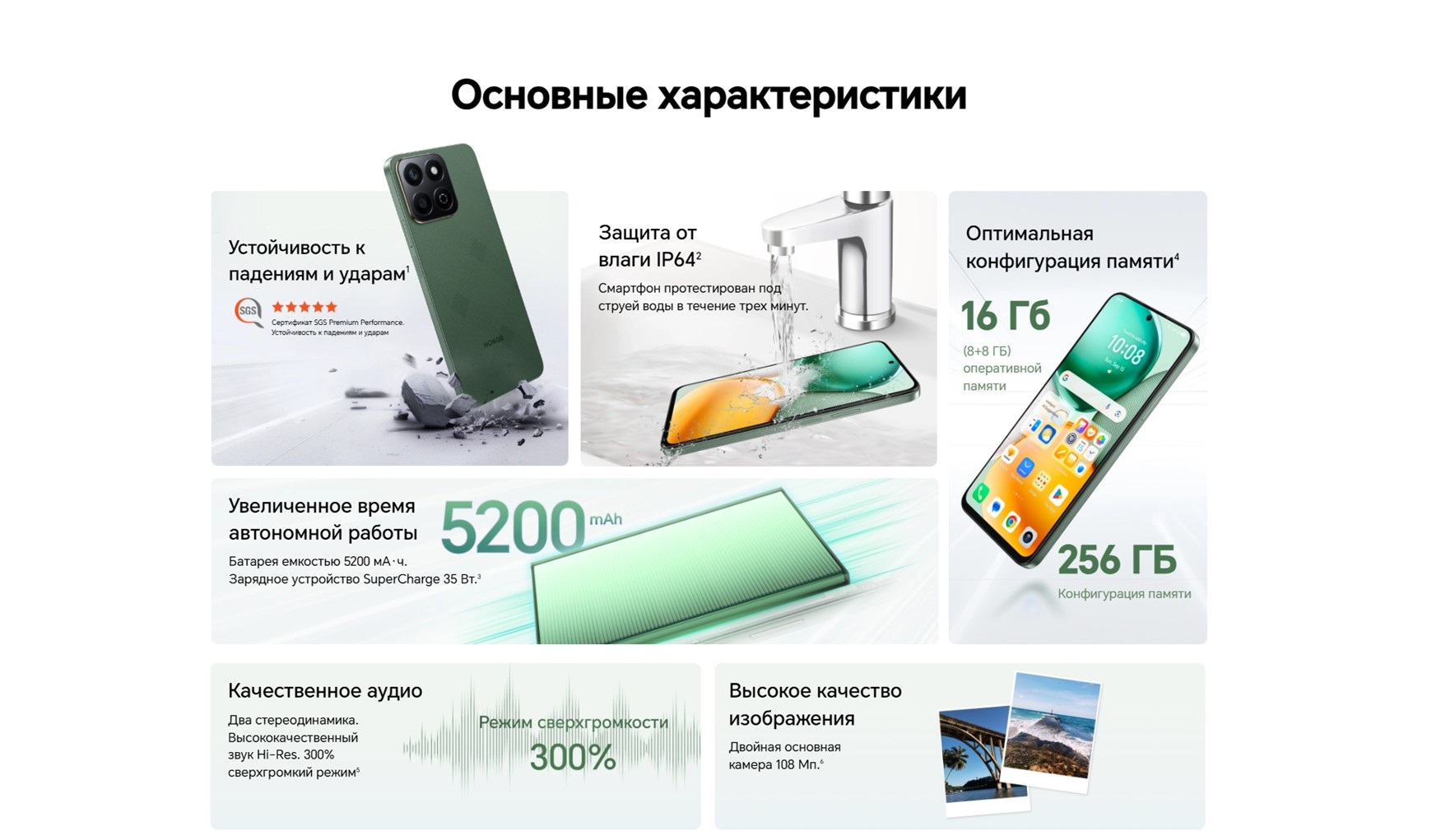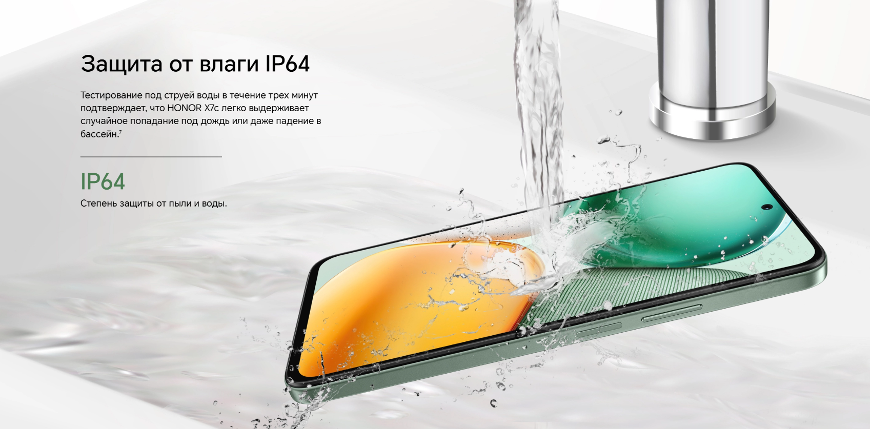*Смартфон не является водонепроницаемым. Защита от влаги и пыли протестирована в лабораторных условиях по стандарту IP64. Устойчивость к воде и пыли не является постоянной характеристикой и может снижаться в результате эксплуатации. Гарантия не распространяется на повреждения от попадания жидкости.