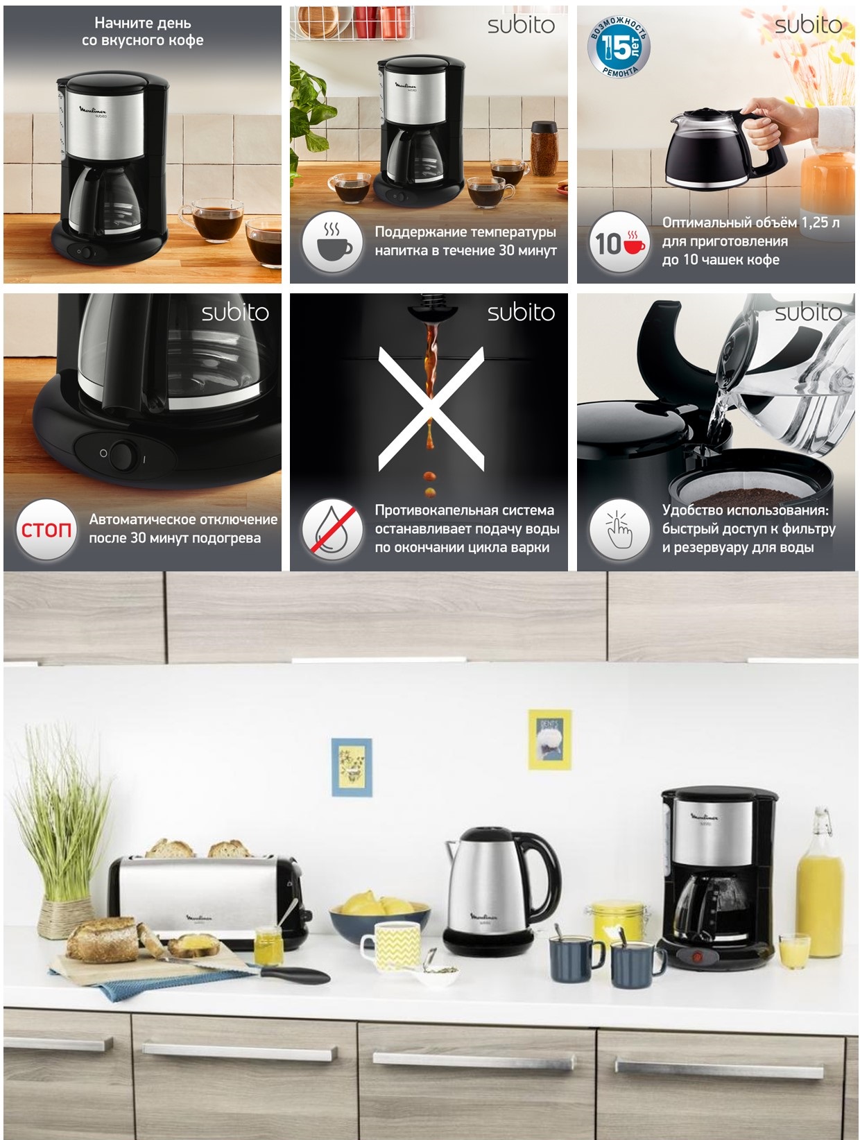 Большая капельная кофеварка Subito Inox превосходно подойдет для приготовления до 15 чашек кофе. Стальной корпус серебристого цвета и стеклянный кувшин прекрасно гармонируют, а противокапельная система не допустит потери ценного напитка и сохранит поверхности вокруг чистыми.