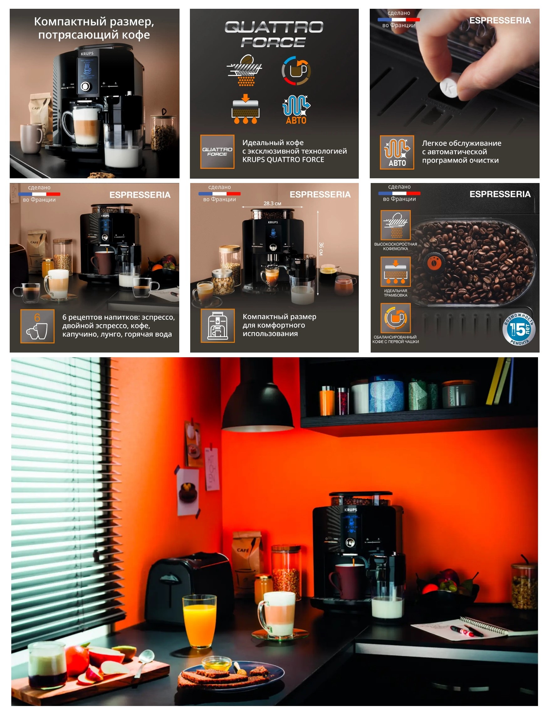 Автоматическая кофемашина KRUPS Espresseria EA829810 в черном цвете — это современная кофемашина с возможностью приготовления капучино, оснащенная электронным управлением для максимально удобного использования. Мощность устройства составляет 1450 Вт, что обеспечивает быстрое приготовление напитков. Контейнер вмещает до 9 кофейных порций. Доступна ручная регулировка степени помола (3 режима), что позволяет подстраивать вкус кофе под индивидуальные предпочтения. Среди полезных функций: удобное обслуживание и простая очистка системы. Производство — Франция.