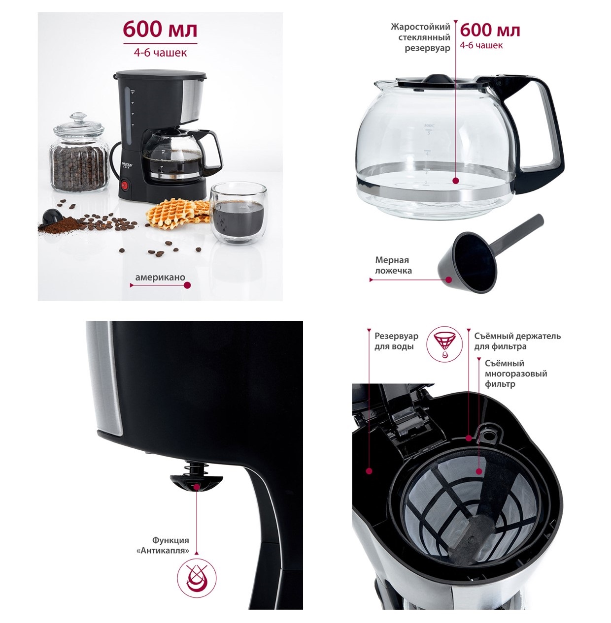 •  Капельная кофеварка отличается от других видов тем, что в процессе работы в приборе не создается давление, вода медленно стекает и по каплям просачивается через кофе