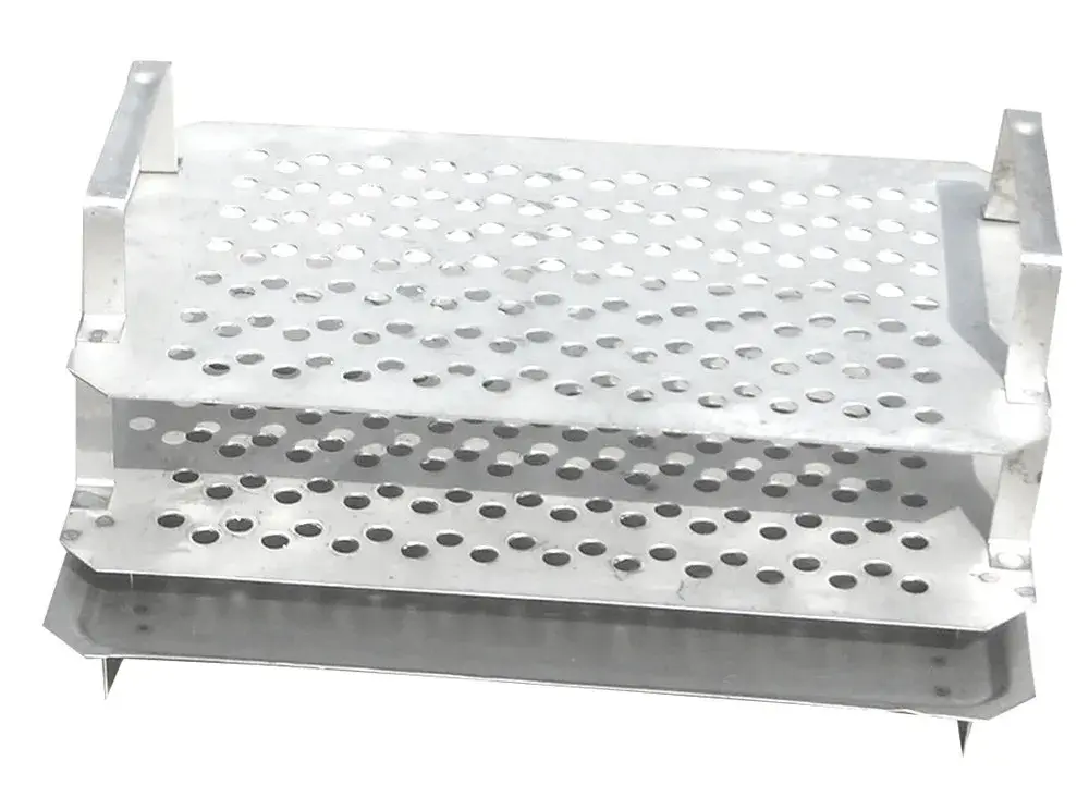 Это устройство состоит из корпуса, поддона для сбора жира, двух решеток и крышки. В корпус коптильни кладут щепу (опилки) желательно ольхи, яблони или вишни, сверху устанавливают поддон и далее размещают одну или две решетки, в зависимости от количества продуктов, накрывают крышкой. Щепа нагревается на костре, на который устанавливают коптильню и выделяет обильный дым от тления. Стекающий с продуктов при копчении жир собирается в поддоне, таким образом они не подгорают.