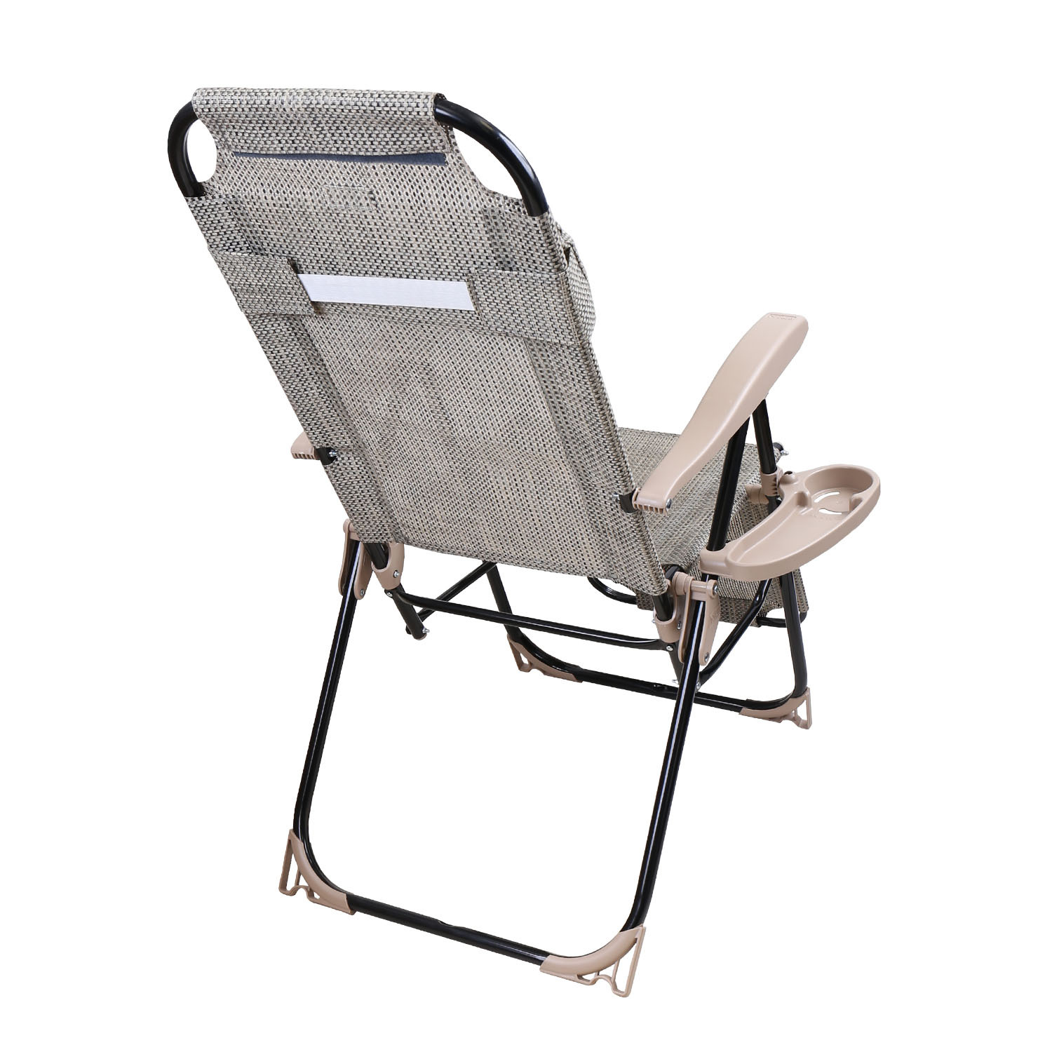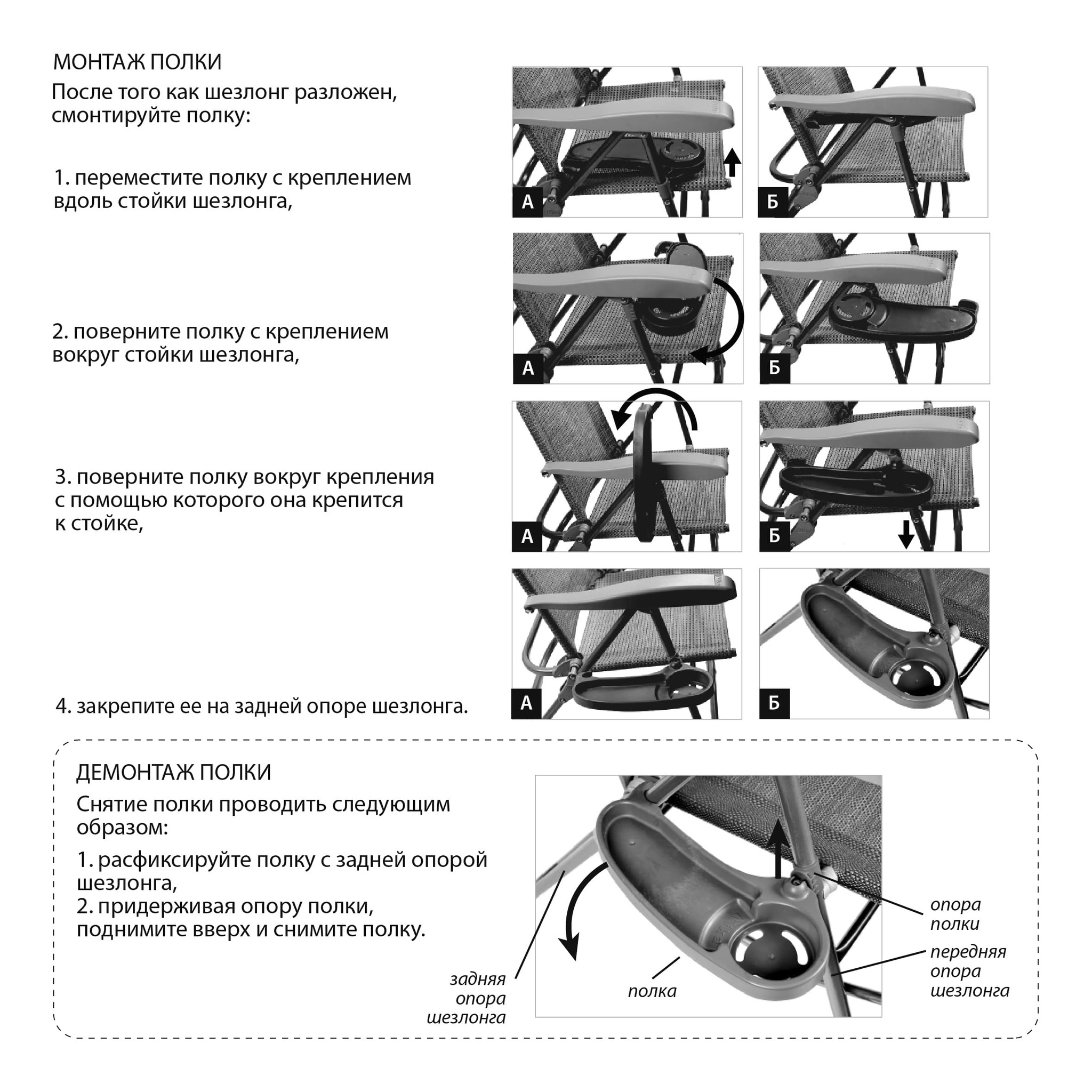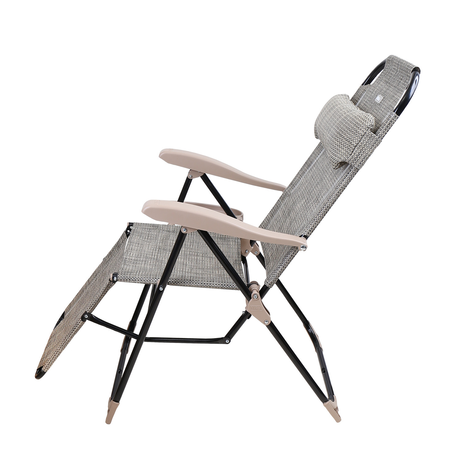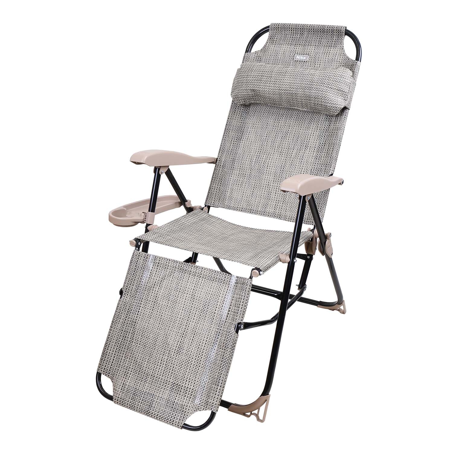 Классическая модель складного кресла-шезлонга с подножкой, дополненная съемной полкой с подстаканником.