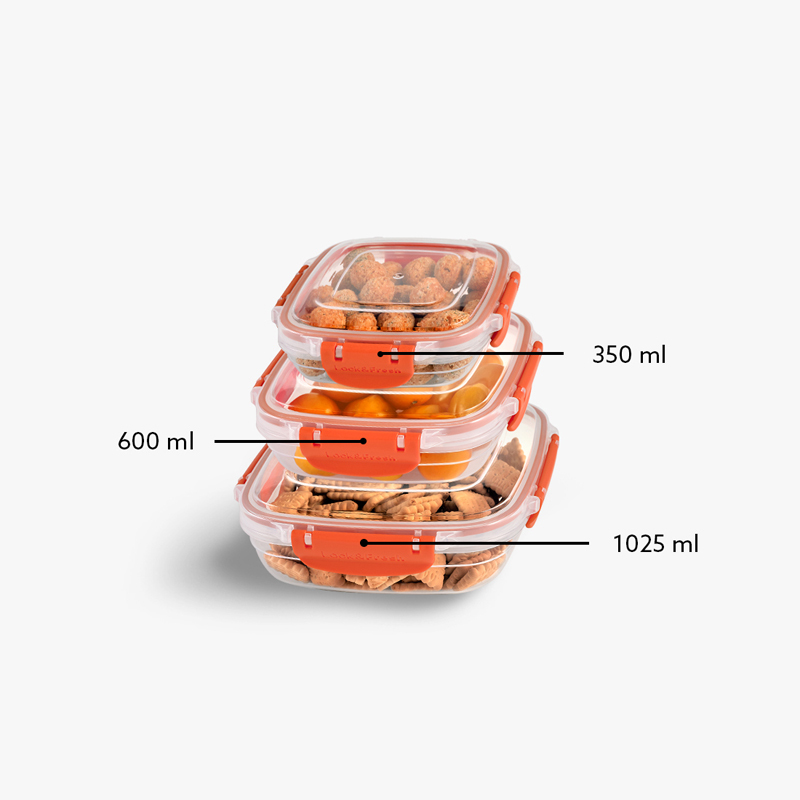 Набор: 350-600-1025 мл Влаго и воздухонепроницаемая крышка позволит вам хранить продукты в 3 раза дольше обычного способа и транспортировать даже жидкие продукты, а стильный дизайн изделий непременно украсит любую сервировку! Можно использовать в микроволновой печи, посудомоечной машине. Продукты под закрытой крышкой надолго сохранят свою свежесть.