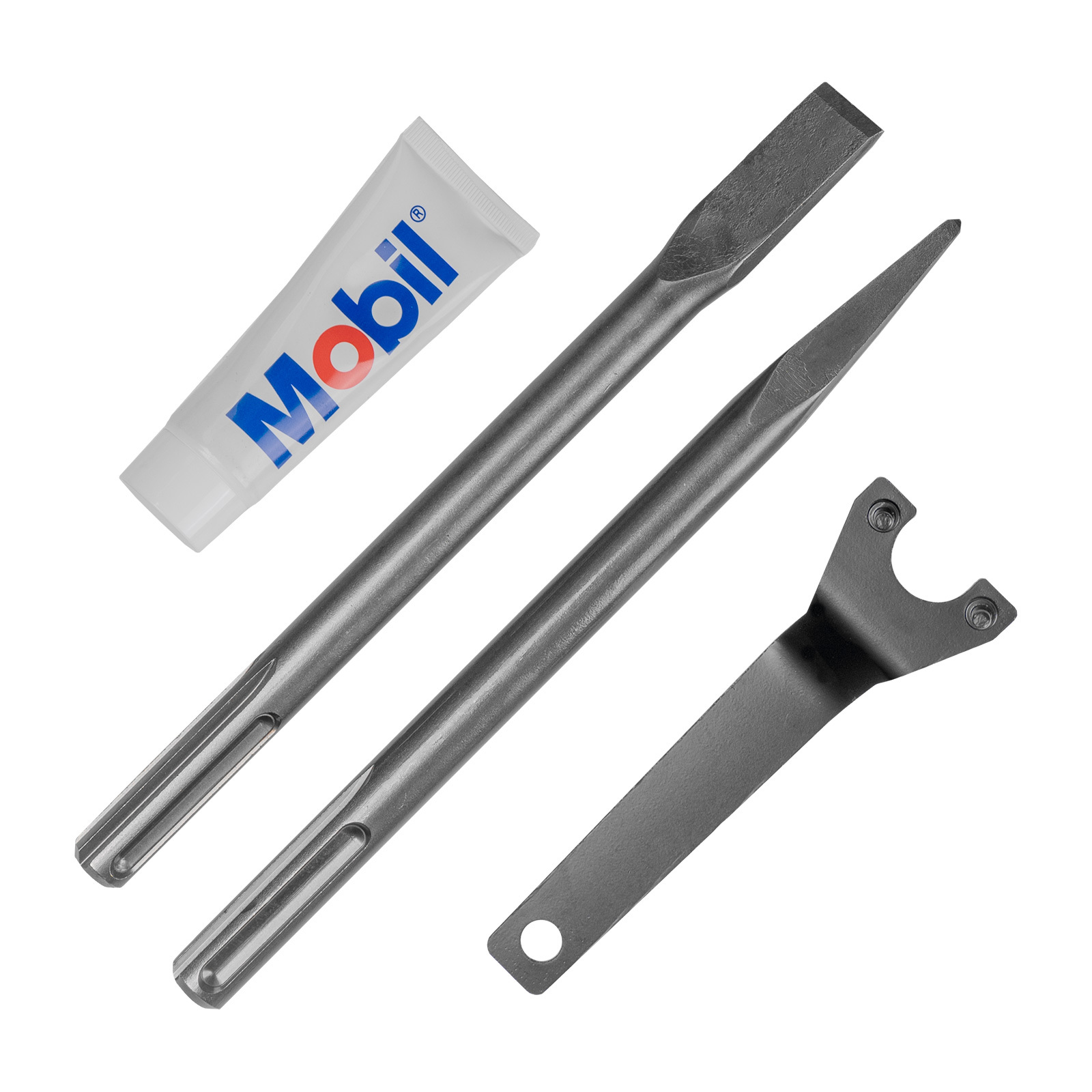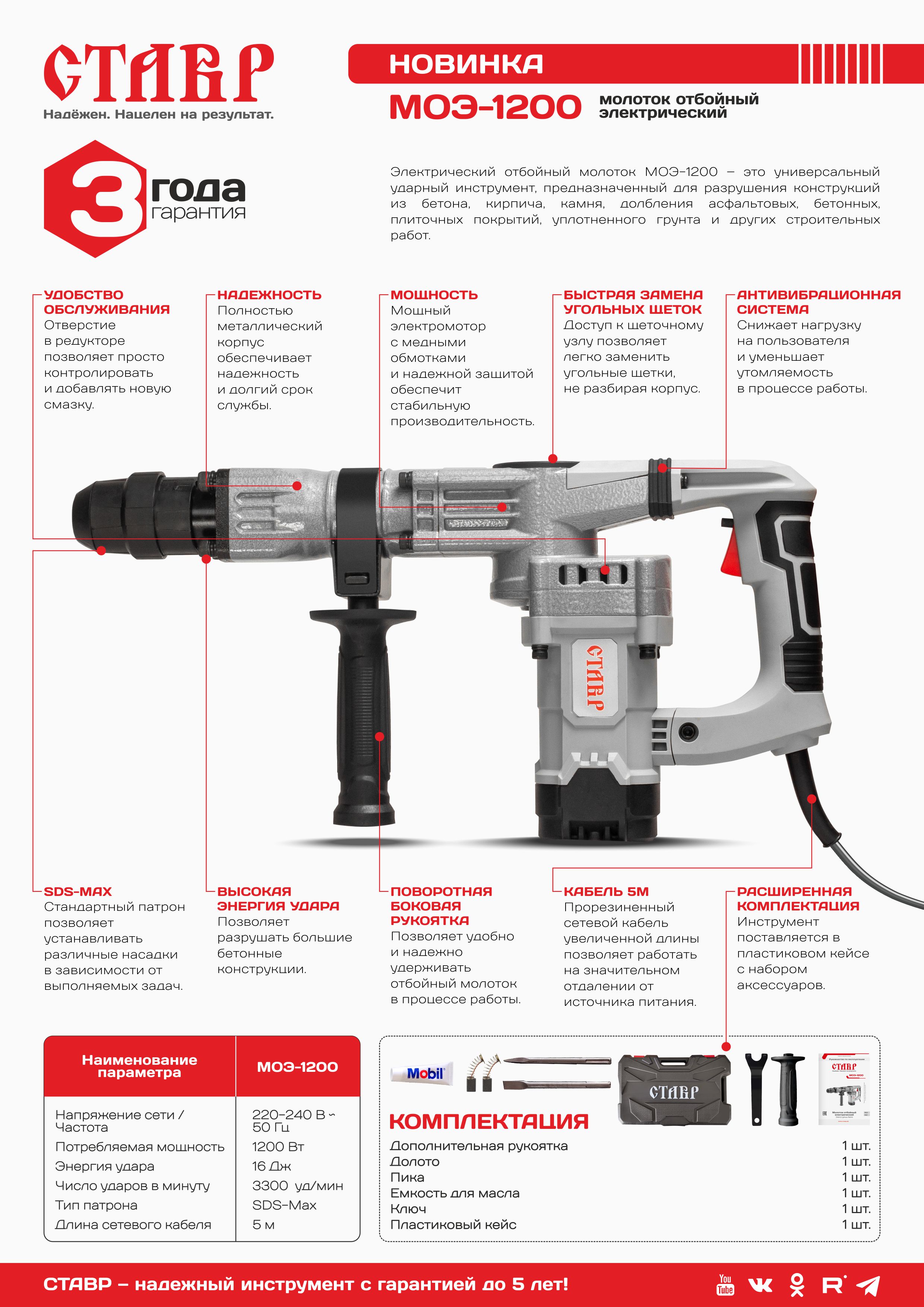 - РАСШИРЕННАЯ КОМПЛЕКТАЦИЯ: Дополнительная рукоятка, долото, пика, емкость для масла, ключ, пластиковый кейс.
