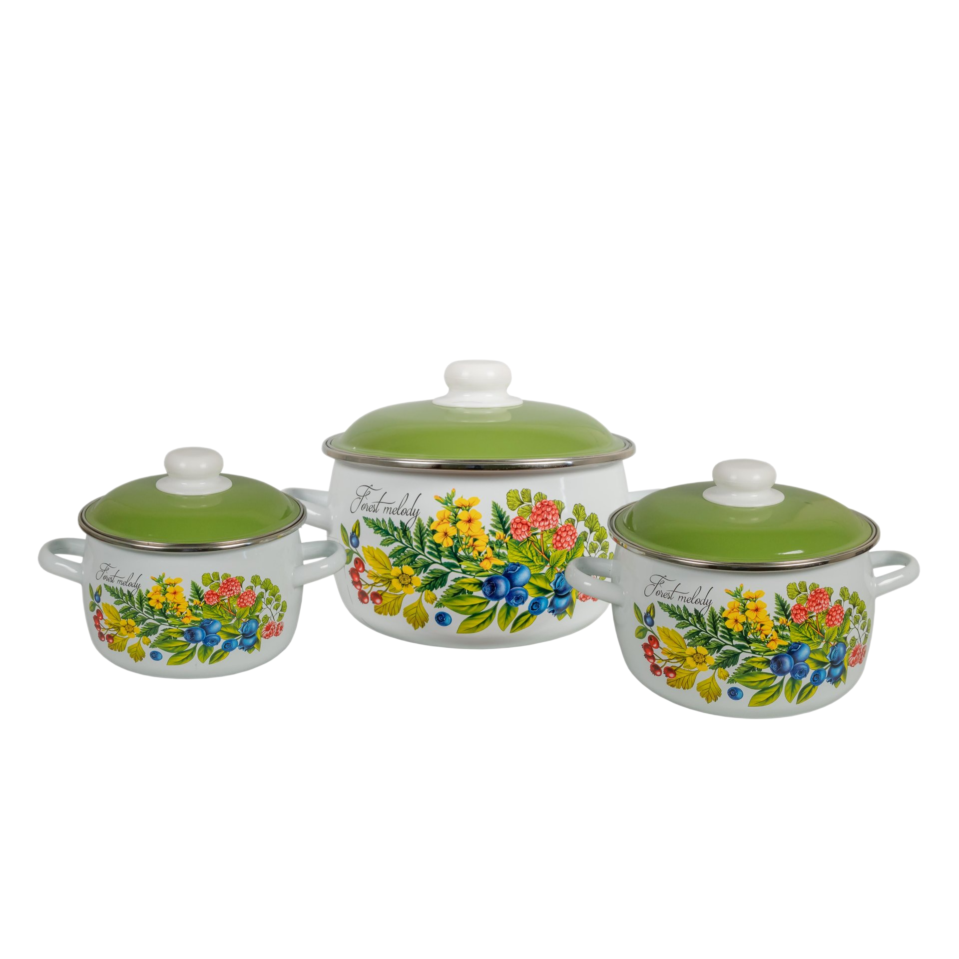 Набор из трех сферических кастрюль. Посуда изготовлена по ГОСТ 24788 из высококачественного стального проката, покрытого двумя слоями жаропрочной эмали. Борта корпусов и крышек кастрюль защищены нержавеющим ободком.