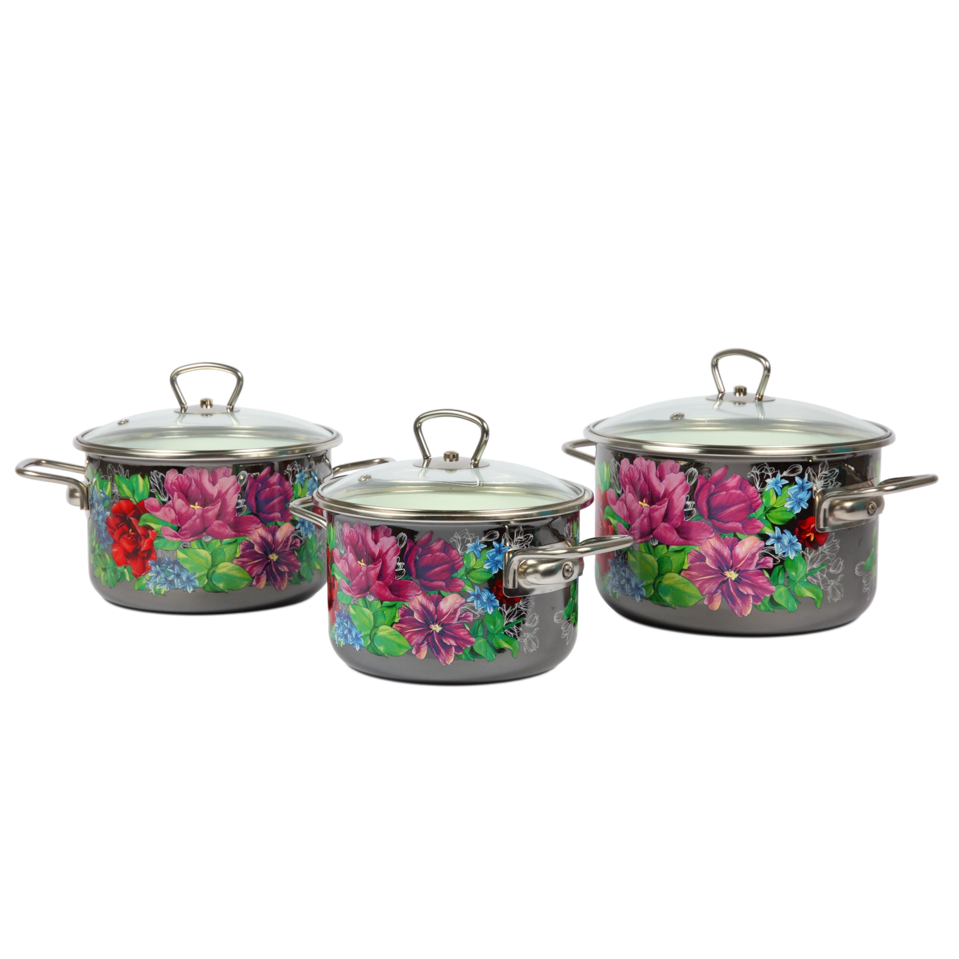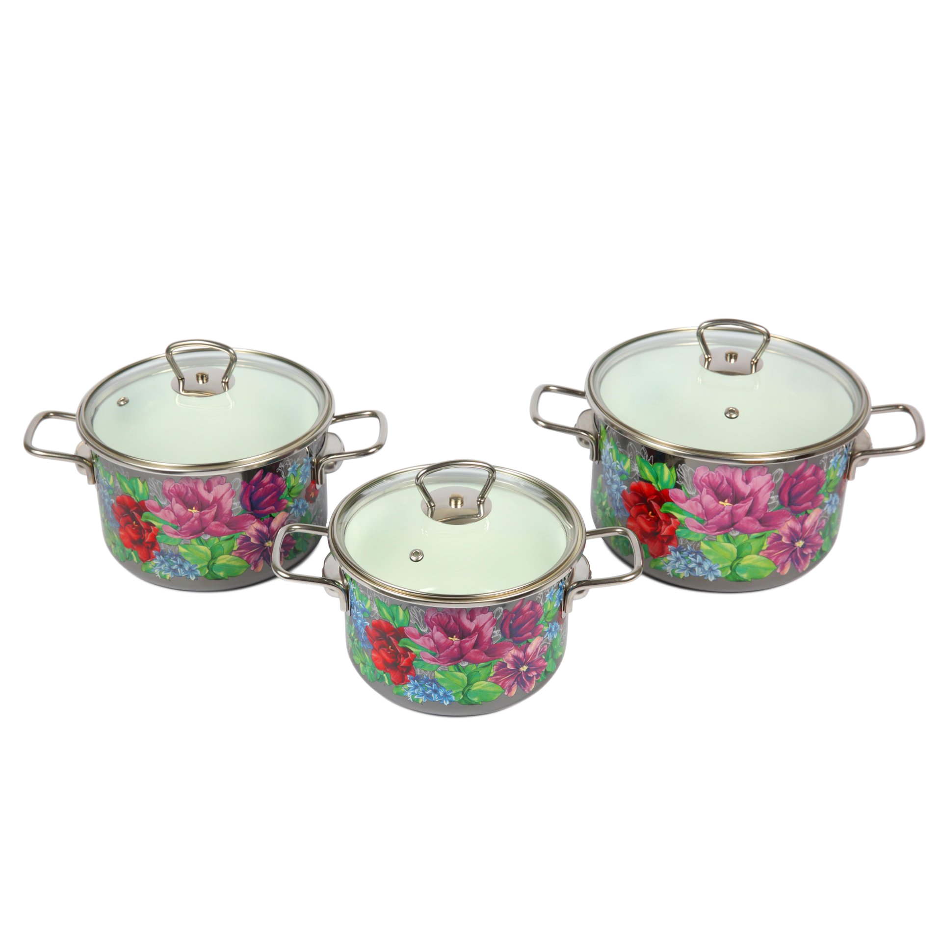 Набор стальных эмалированных кастрюль цилиндрической формы для тепловой обработки пищевых продуктов. Кастрюли комплектуются крышками из жаропрочного стекла с пароотводом, эргономичными ручками из коррозионно-стойкой стали, борта защищены нержавеющим ободком. Посуда изготовлена по ГОСТ 24788 из  высококачественного стального проката, покрытого двумя слоями жаропрочной эмали. Эмалевое покрытие на основе силикатных фритт, являясь стекольной массой, не вступает во взаимодействие с продуктами, не искажает их вкусовые качества, не окисляется, при нагревании не выделяет опасные для здоровья человека соединения. Многослойное эмалевое покрытие практично, долговечно и устойчиво к появлению царапин и сколов. Прочный металлический корпус не деформируется в процессе эксплуатации и  гарантирует эффективную тепловую обработку пищи.