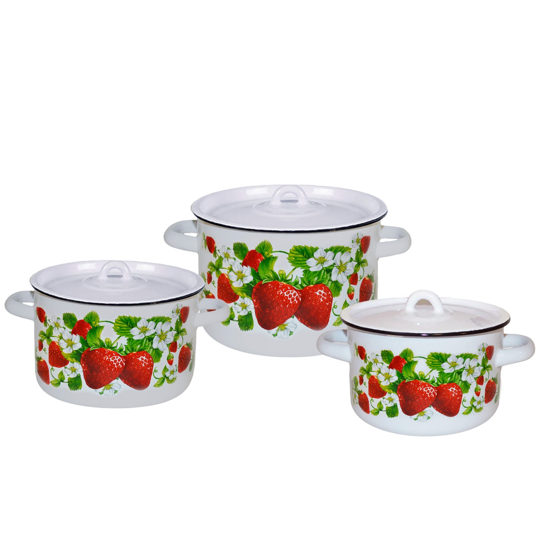 Набор их трёх цилиндрических кастрюль с высоким корпусом изготовлен по ГОСТ 24788 из высококачественного стального проката, покрытого двумя слоями жаропрочной эмали. Эмалевое покрытие на основе силикатных фритт, являясь стекольной массой, не вступает во взаимодействие с продуктами, не искажает их вкусовые качества, не окисляется, при нагревании не выделяет опасные для здоровья человека соединения. Многослойное эмалевое покрытие практично, долговечно и устойчиво к появлению царапин и сколов. Прочный металлический корпус не деформируется в процессе эксплуатации и гарантирует эффективную тепловую обработку пищи.