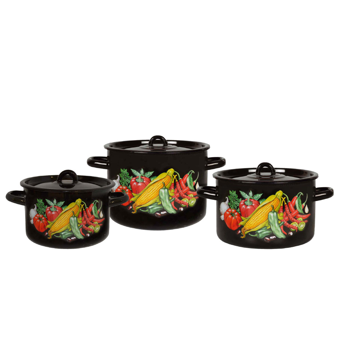 Набор их трёх цилиндрических кастрюль с высоким корпусом изготовлен по ГОСТ 24788 из  высококачественного стального проката, покрытого двумя слоями жаропрочной эмали. Эмалевое покрытие на основе силикатных фритт, являясь стекольной массой, не вступает во взаимодействие с продуктами, не искажает их вкусовые качества, не окисляется, при нагревании не выделяет опасные для здоровья человека соединения. Многослойное эмалевое покрытие практично, долговечно и устойчиво к появлению царапин и сколов. Прочный металлический корпус не деформируется в процессе эксплуатации и  гарантирует эффективную тепловую обработку пищи.
