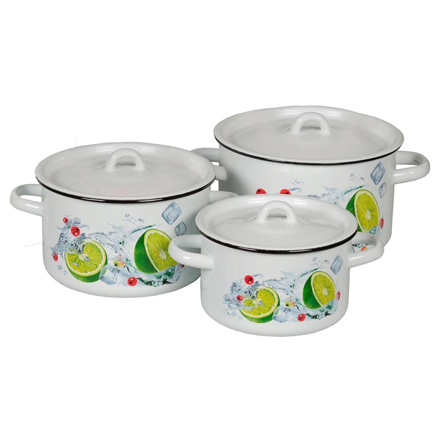 Набор их трёх цилиндрических кастрюль с высоким корпусом изготовлен по ГОСТ 24788 из  высококачественного стального проката, покрытого двумя слоями жаропрочной эмали. Эмалевое покрытие на основе силикатных фритт, являясь стекольной массой, не вступает во взаимодействие с продуктами, не искажает их вкусовые качества, не окисляется, при нагревании не выделяет опасные для здоровья человека соединения. Многослойное эмалевое покрытие практично, долговечно и устойчиво к появлению царапин и сколов. Прочный металлический корпус не деформируется в процессе эксплуатации и  гарантирует эффективную тепловую обработку пищи.