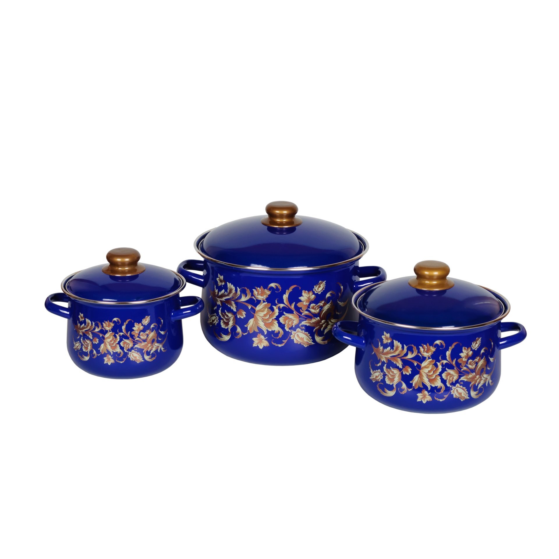 Набор из трех  кастрюль конической формы с высоким корпусом. Посуда изготовлена по ГОСТ 24788 из высококачественного стального проката, покрытого двумя слоями жаропрочной эмали. Борта корпусов и крышек кастрюль защищены нержавеющим ободком.