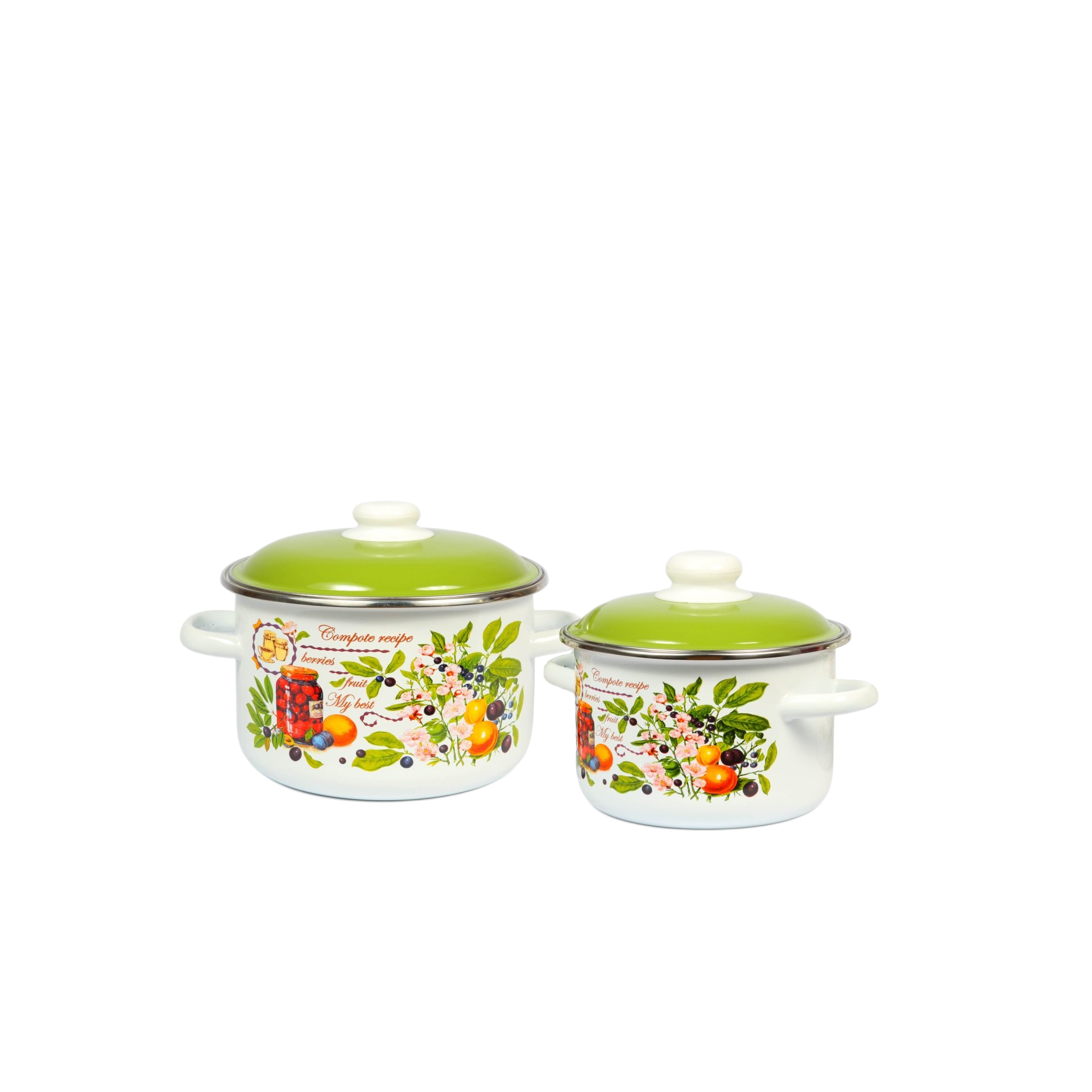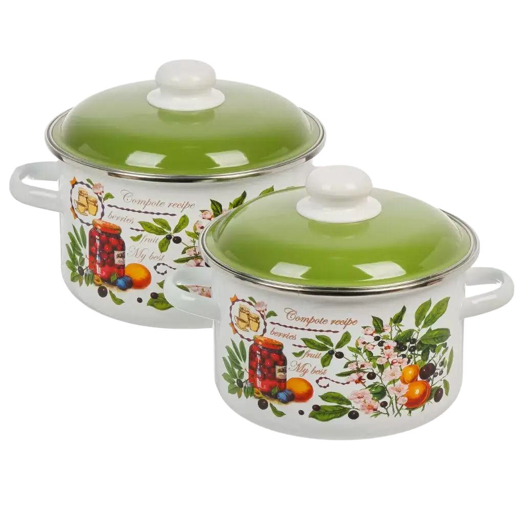 Набор из двух цилиндрических кастрюль. Посуда изготовлена по ГОСТ 24788 из высококачественного стального проката, покрытого двумя слоями жаропрочной эмали. Борта корпусов и крышек кастрюль защищены нержавеющим ободком.