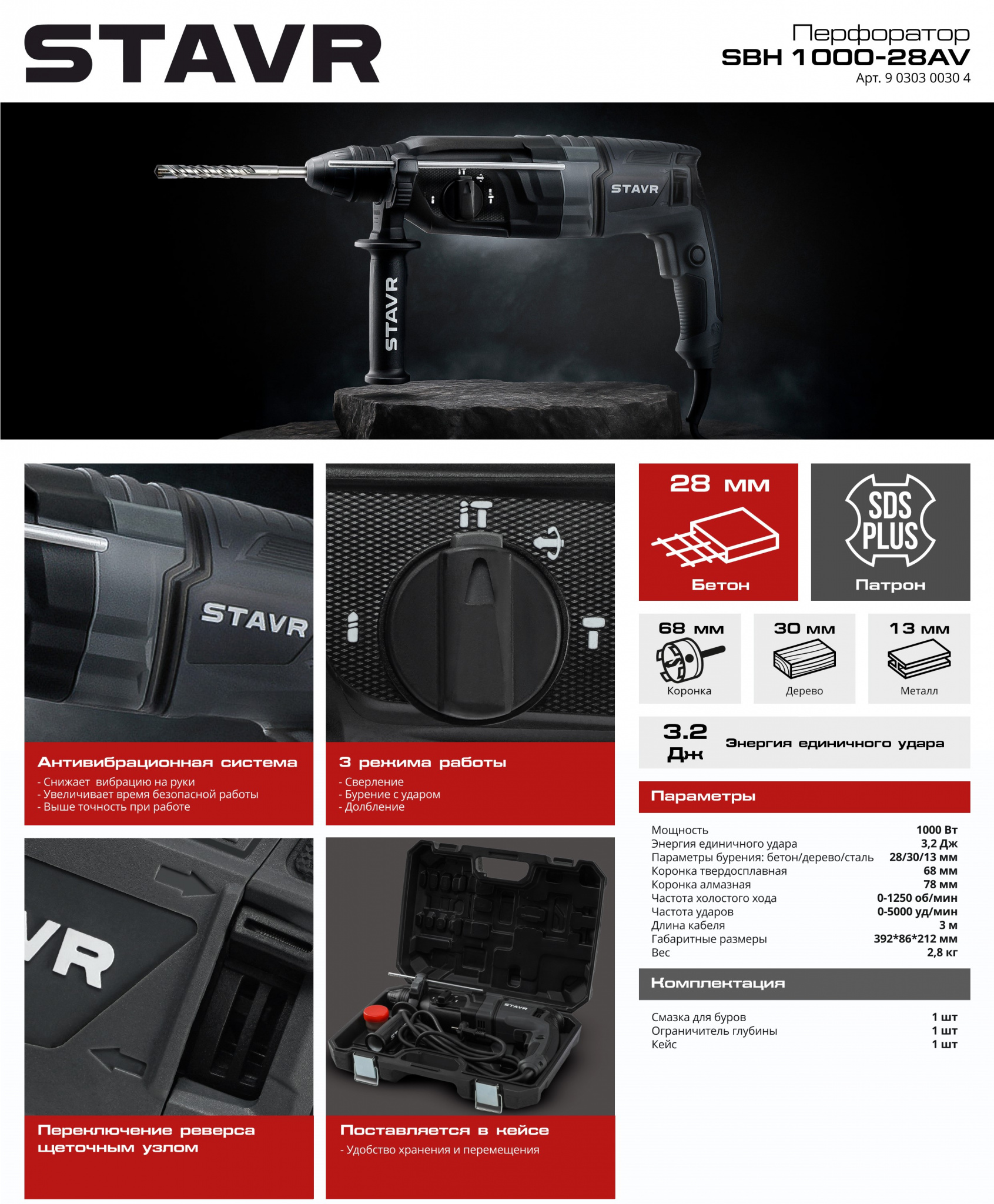 ВЫСОКАЯ МОЩНОСТЬ: двигатель 1000 Вт и энергия удара 3,2 Дж обеспечивают эффективное бурение и долбление даже в твердых материалах.