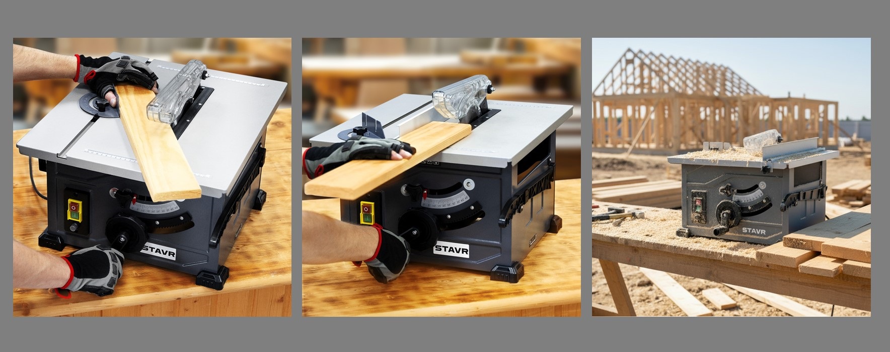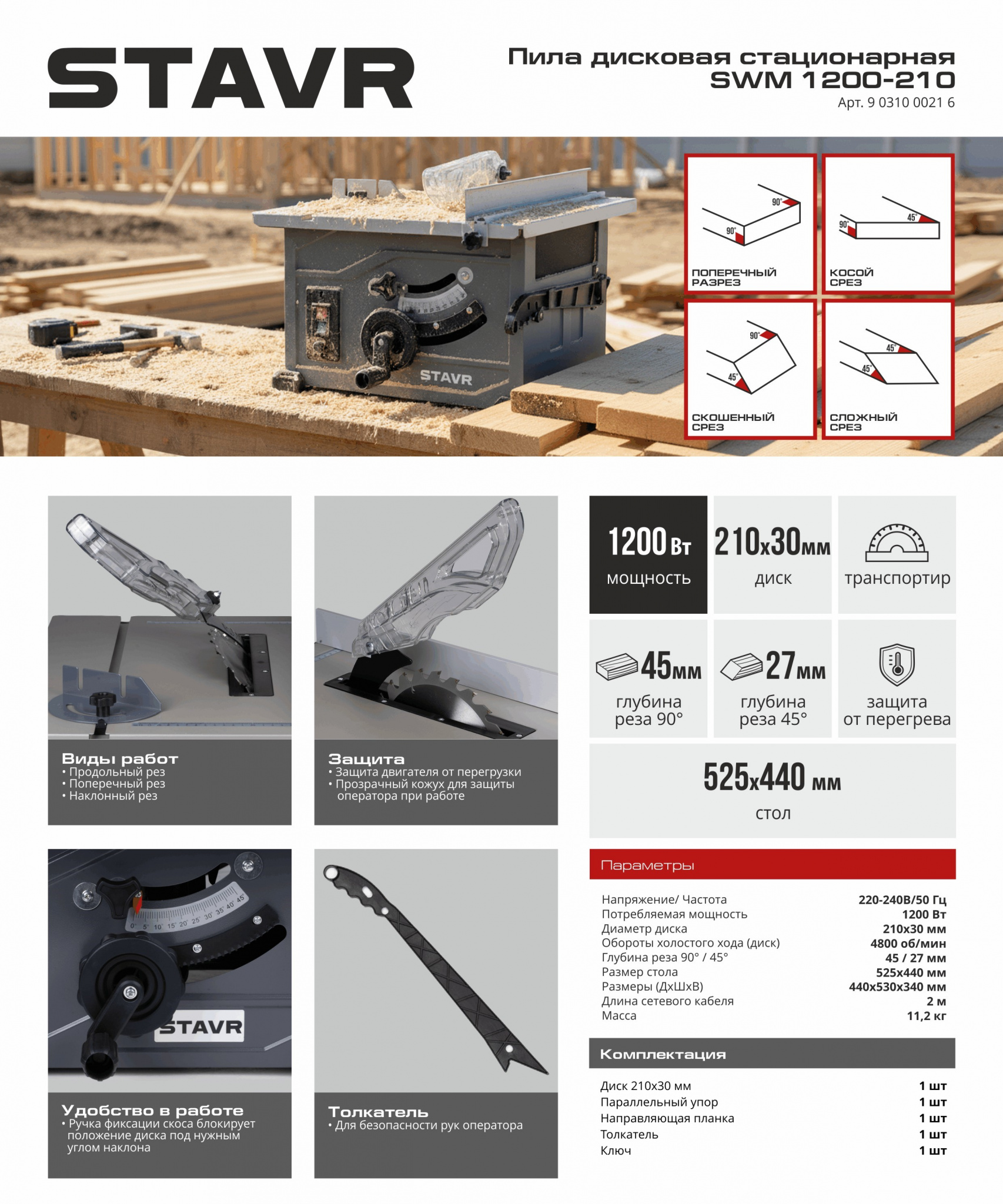 Комплектация: стационарная пила, диск 210х30 мм, параллельный упор, направляющая планка, толкатель, ключ, руководство по эксплуатации.