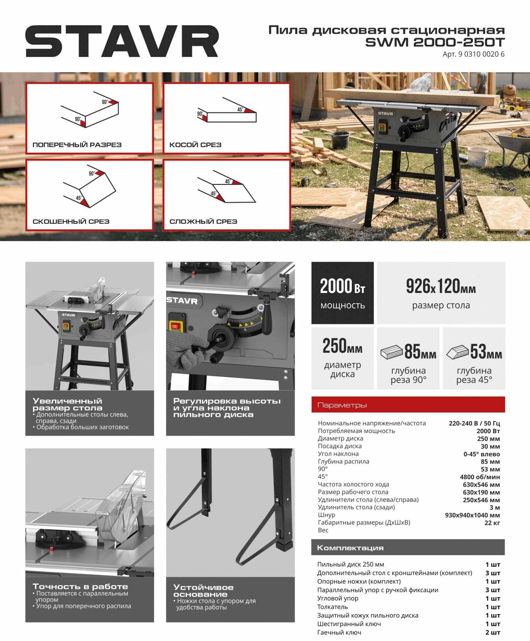 КОМПЛЕКТАЦИЯ: пильный диск (250 мм), дополнительные столы с кронштейнами (3 комплекта), комплект опорных ножек, параллельный упор с фиксатором, угловой упор, толкатель, защитный кожух, шестигранный ключ, 2 гаечных ключа, руководство по эксплуатации.
