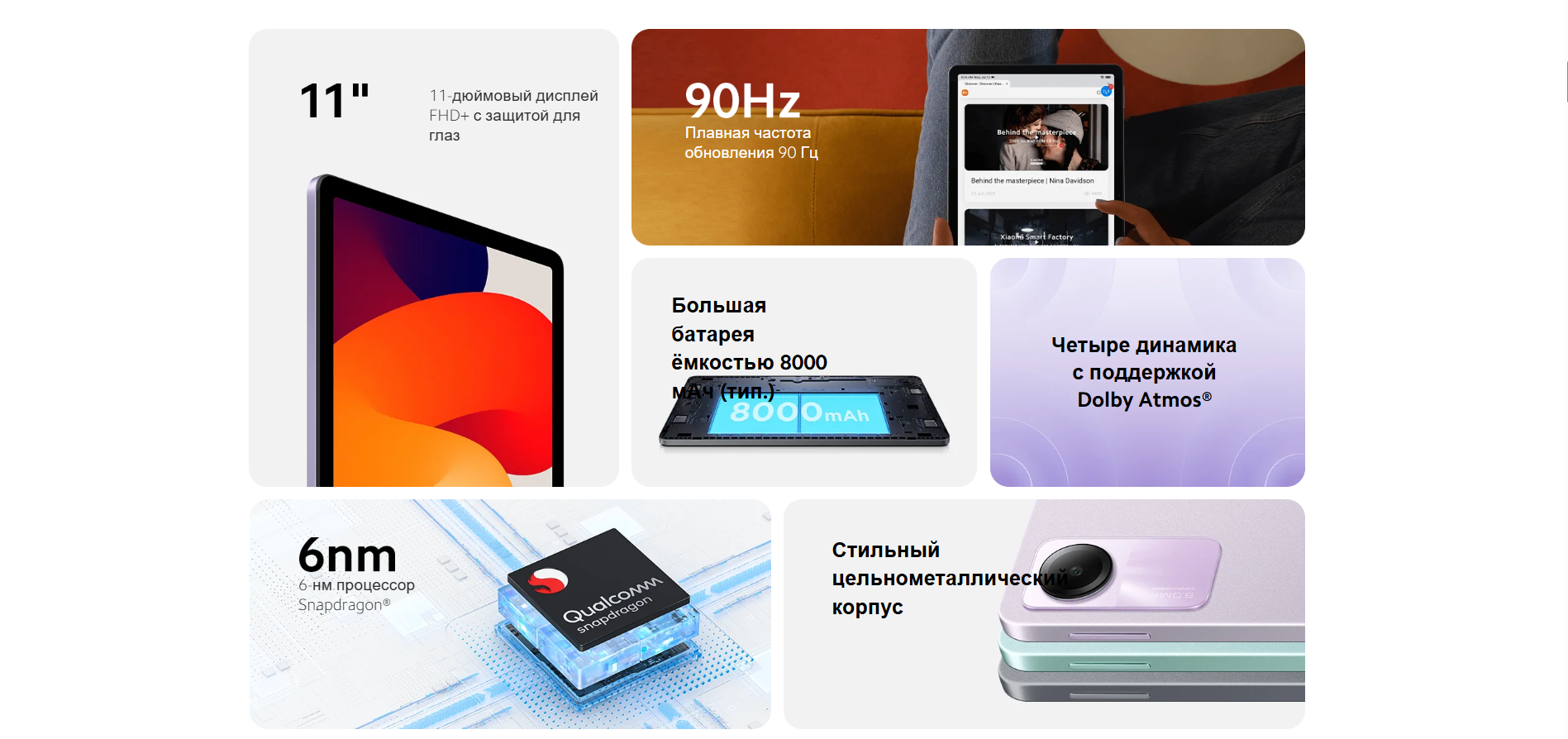 255,53 мм x 167,08 мм x 7,36 мм Цельнолитой корпус из алюминиевого сплава*Данные получены в внутренних лабораториях Xiaomi. Методы измерения в отрасли могут отличаться, поэтому фактические результаты могут отличаться.*Данные о размерах и весе получены в внутренних лабораториях Xiaomi, фактические результаты могут отличаться.