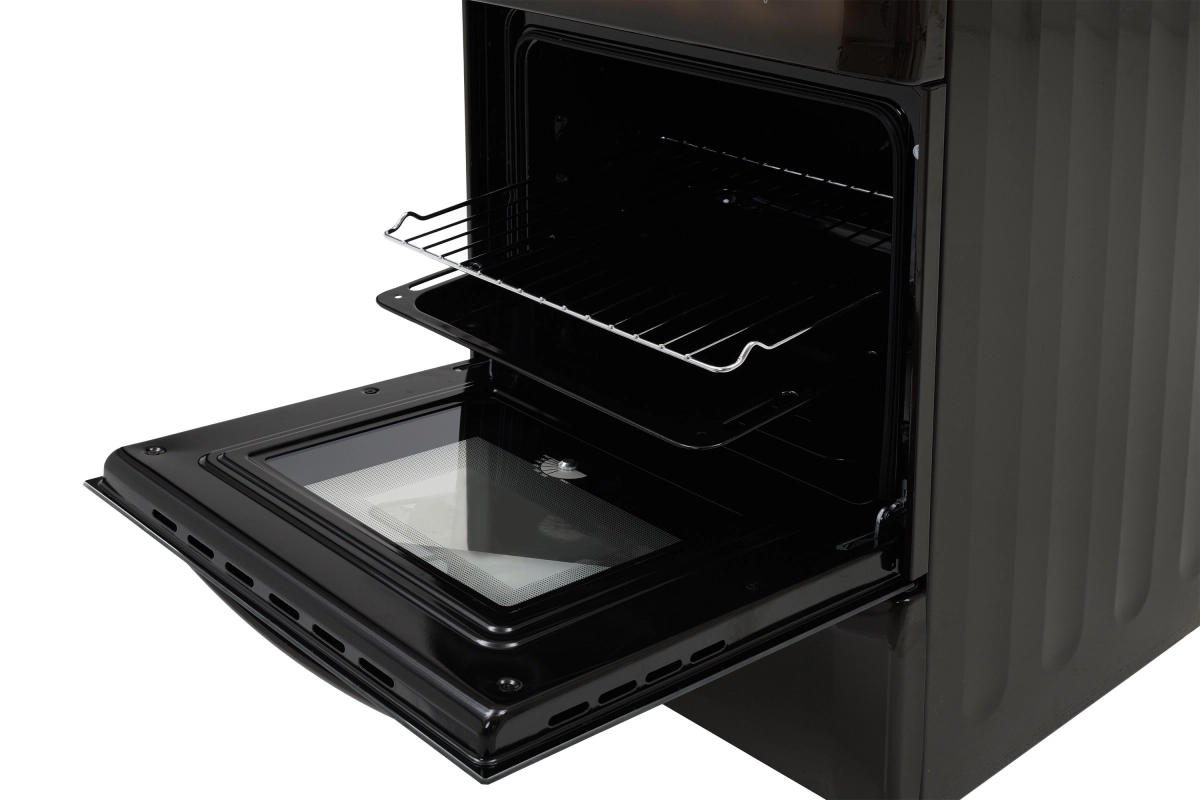 Духовка оборудована системой газ-контроля и внутренней подсветкой, что обеспечивает безопасность в процессе приготовления пищи. Уровень нагрева можно определить с помощью термометра, расположенного на дверце.