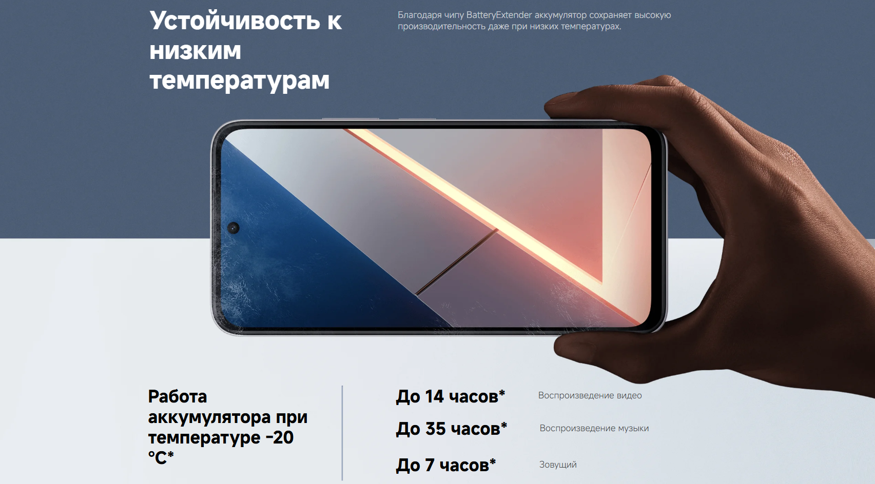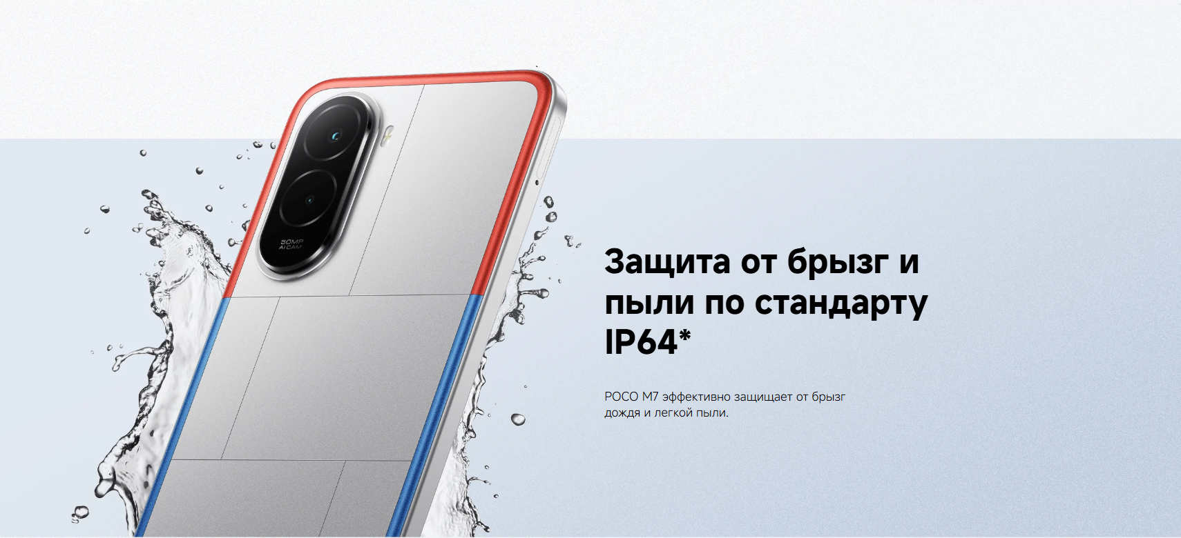 IP64* Устройство с классом защиты IP64 прошло испытания на устойчивость к брызгам и пыли в специальных лабораторных условиях в соответствии с классификацией защиты от проникновения IP64 по стандарту IEC 60529: 1989+A1:1999+A2:2013. Устойчивость не является постоянной и со временем может снизиться естественным образом. Если ваше устройство намокло, не пытайтесь его зарядить. Реальные условия отличаются от экспериментальных. Не погружайте смартфон полностью в воду и не подвергайте его воздействию таких растворов, как морская и хлорированная вода, а также таких жидкостей, как напитки, во время повседневного использования. Гарантия не распространяется на повреждения, вызванные искусственным погружением устройства в жидкость.