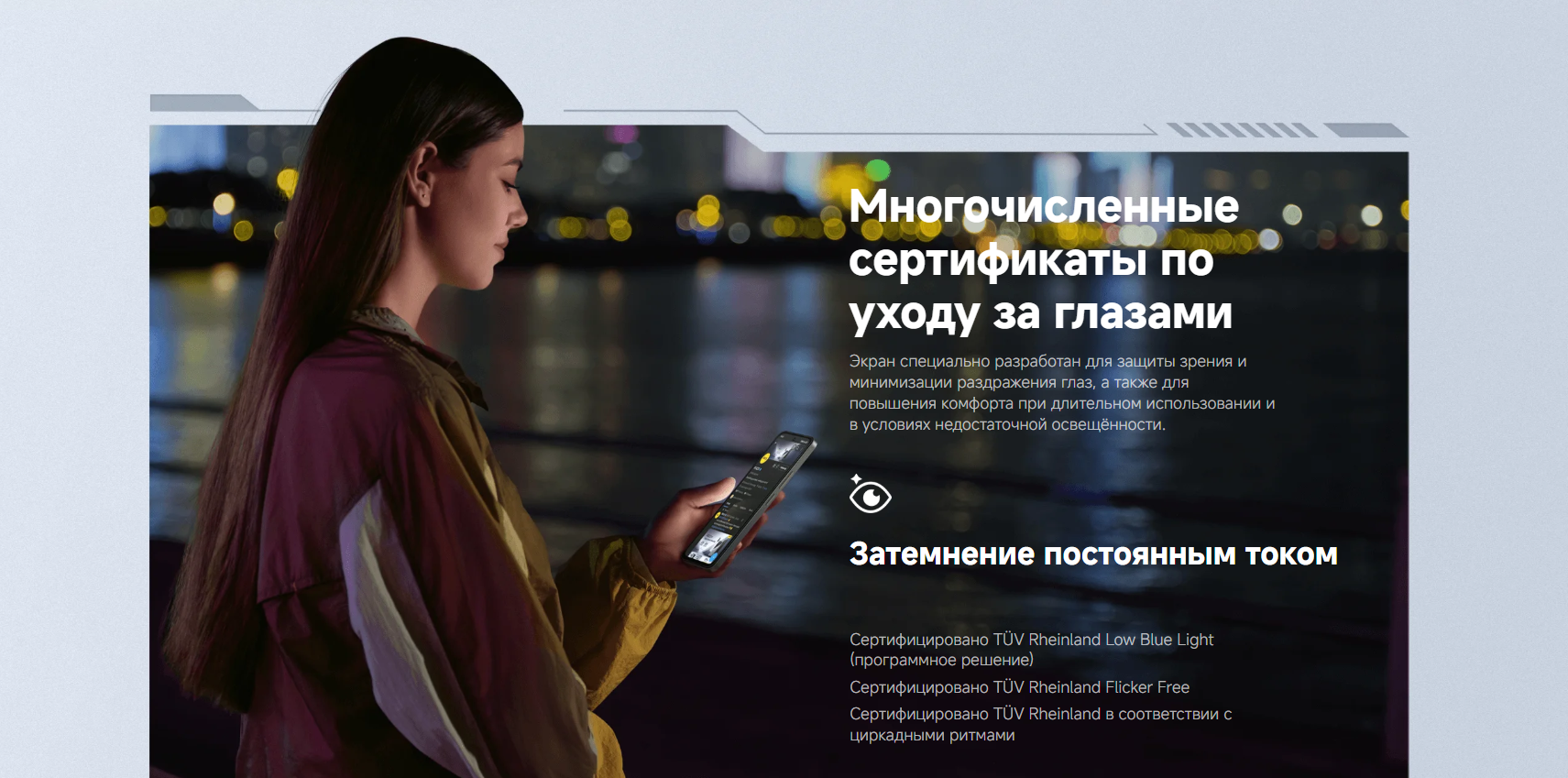 6,9-дюймовый дисплей FHD+ DotDisplay Разрешение: 2340 × 1080PPI 374 Частота обновления: до 144 Гц**Частота обновления может быть увеличена до 144 Гц для поддерживаемых приложений.Частота дискретизации касаний: до 288 Гц Яркость: 700 нит (тип.) 850 нит (HBM)Коэффициент контрастности: 1400:1 Цветовой охват: 85 % NTSC Режим чтенияСертифицировано TÜV Rheinland «Низкий уровень синего света» (программное решение) Сертифицировано TÜV Rheinland «Циркадные ритмы» Сертифицировано TÜV Rheinland «Отсутствие мерцания»