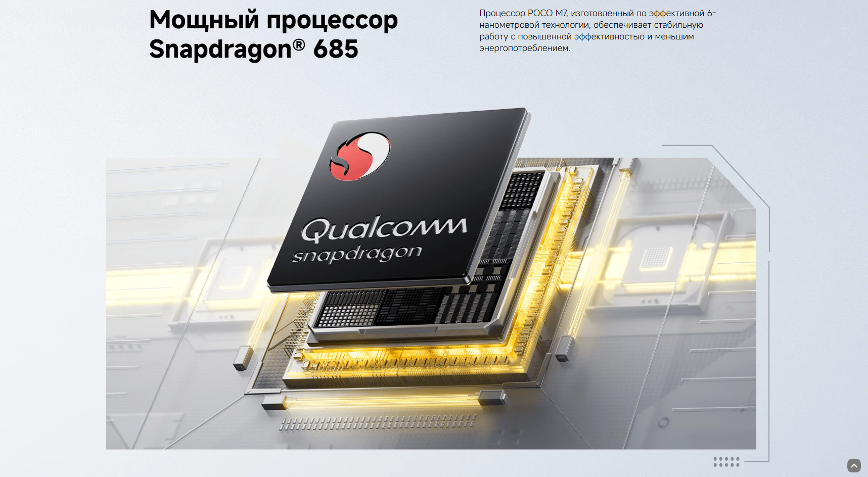 Мобильная платформа Snapdragon® 685 4G6-нм техпроцесс, восьмиядерный чипсет Процессор: Qualcomm® Kryo™, до 2,8 ГГц Графический процессор: Qualcomm® Adreno™