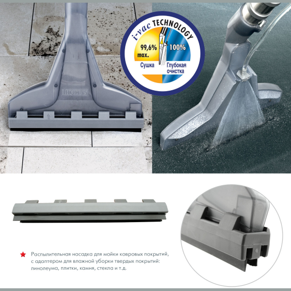 THOMAS Wave XT – это многофункциональный пылесос, который производится в Германии и отличается высоким качеством сборки, материалов и аксессуаров. Wave XT наведет у вас дома идеальную чистоту. Функция влажной уборки дает возможность сделать глубокую чистку ковров и мягкой мебели, а также тщательно и без разводов вымыть пол. Пылесос без труда удалит пятна на текстильных изделиях и придаст им свежий, обновленный вид.