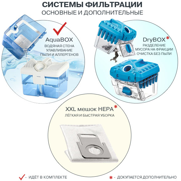 Кроме того, у Wave XT есть еще и функция очистки воздуха. Во время обычной сухой уборки пылесос на 99,99% очищает воздух от пыли и на 100% - от пыльцы. Это происходит благодаря запатентованной системе водяной фильтрации AQUA-BOX с системой подавления пыли Wet-Jet.