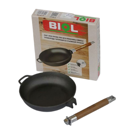 Сковорода диаметром 22 см. Изготовлена из высококачественного литого чугуна, благодаря чему обеспечивает равномерный нагрев и надолго сохраняет тепло. Подходит для всех типов плит. Укомплектована съемной ручкой из натурального дерева. Упакована в фирменную подарочную упаковку.