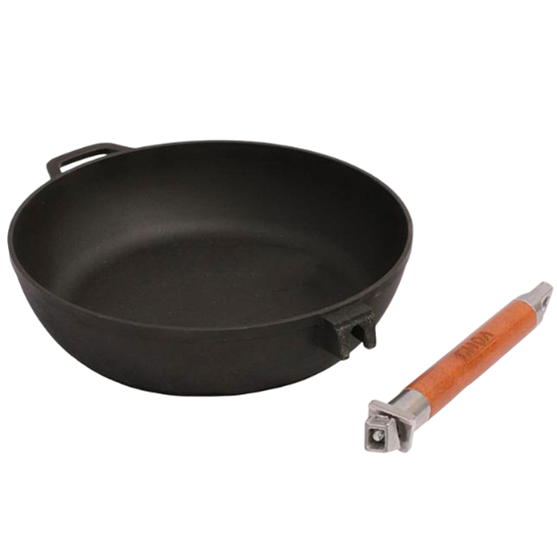 Сковорода диаметром 24 см. Изготовлена из высококачественного литого чугуна, благодаря чему обеспечивает равномерный нагрев и надолго сохраняет тепло. Подходит для всех типов плит. Укомплектована съемной ручкой из натурального дерева. Упакована в фирменную подарочную упаковку.