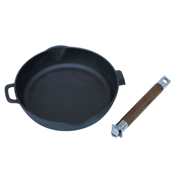 Сковорода диаметром 28 см. Изготовлена из высококачественного литого чугуна, благодаря чему обеспечивает равномерный нагрев и надолго сохраняет тепло. Подходит для всех типов плит. Укомплектована съемной ручкой из натурального дерева. Упакована в фирменную подарочную упаковку.