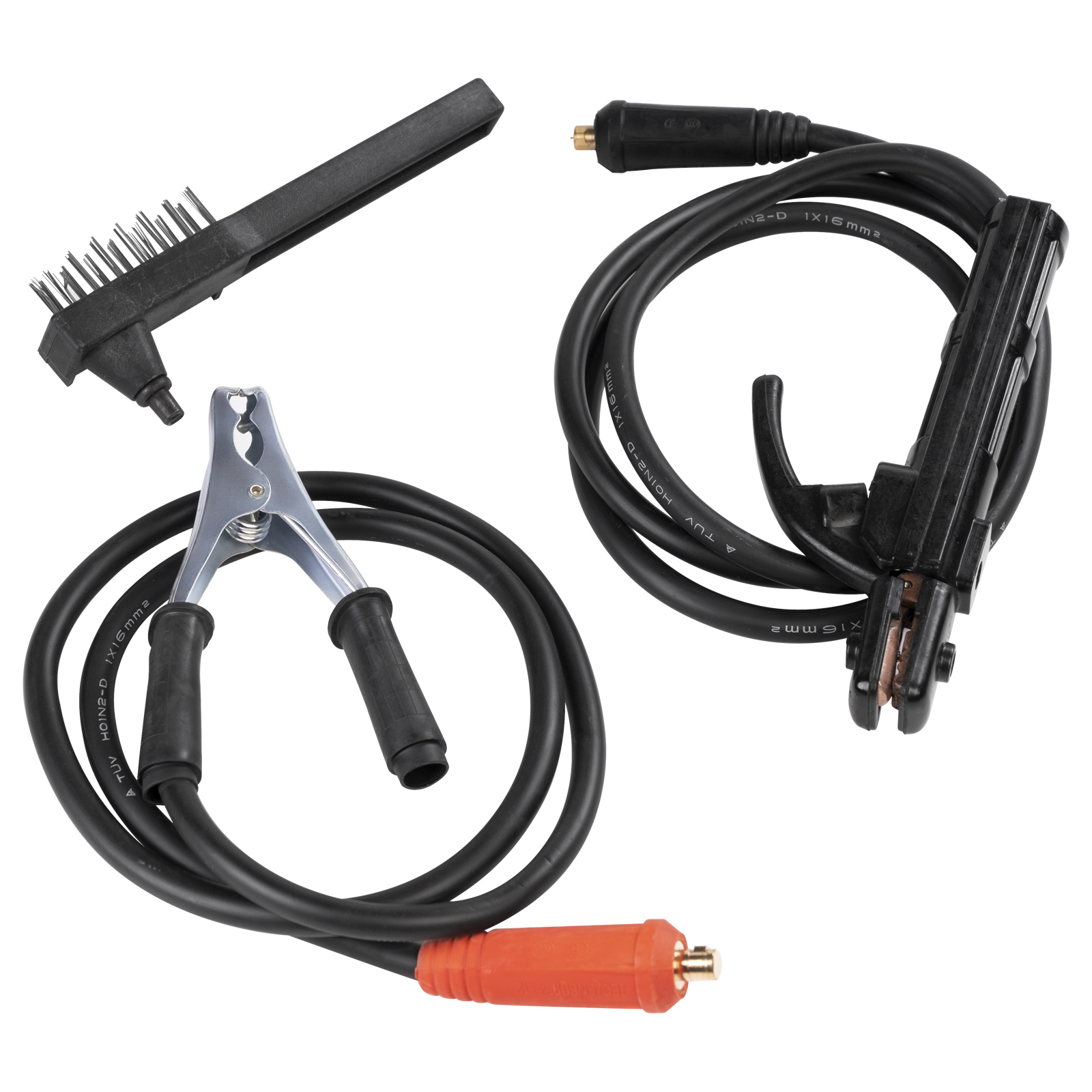 - КОМПЛЕКТАЦИЯ: Рабочий кабель с электрододержателем, кабель заземления с клеммой, металлическая щетка, наплечный ремень.