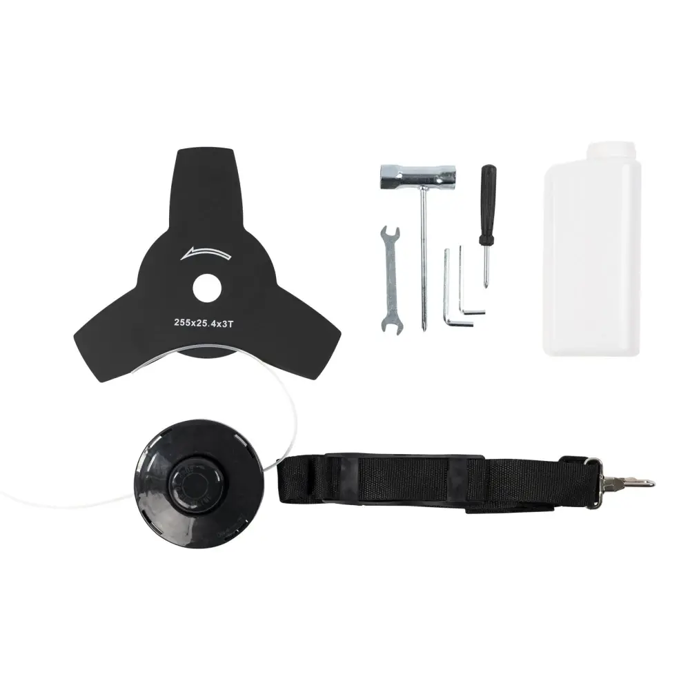 - КОМПЛЕКТАЦИЯ: емкость для приготовления смеси, плечевой ремень, ключ шестигранный Г-образный (2 шт), ключ свечной, ключ рожковый, отвертка, набор крепежа, катушка с леской, нож.