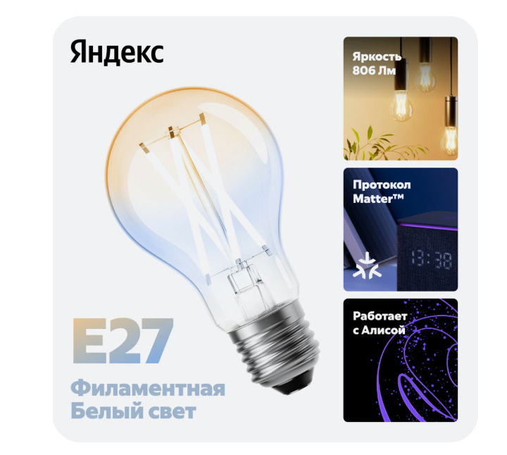 Лампочка работает на протоколе Matter™ over Wi-Fi®, она легко подключается к умному дому, а настроенные сценарии с лампочкой могут работать, даже если отключится интернет¹. Для подключения к умному дому вам потребуются приложение Дом с Алисой и одна из совместимых Яндекс Станций или другое устройство с хабом, поддерживающим протокол Matter™².