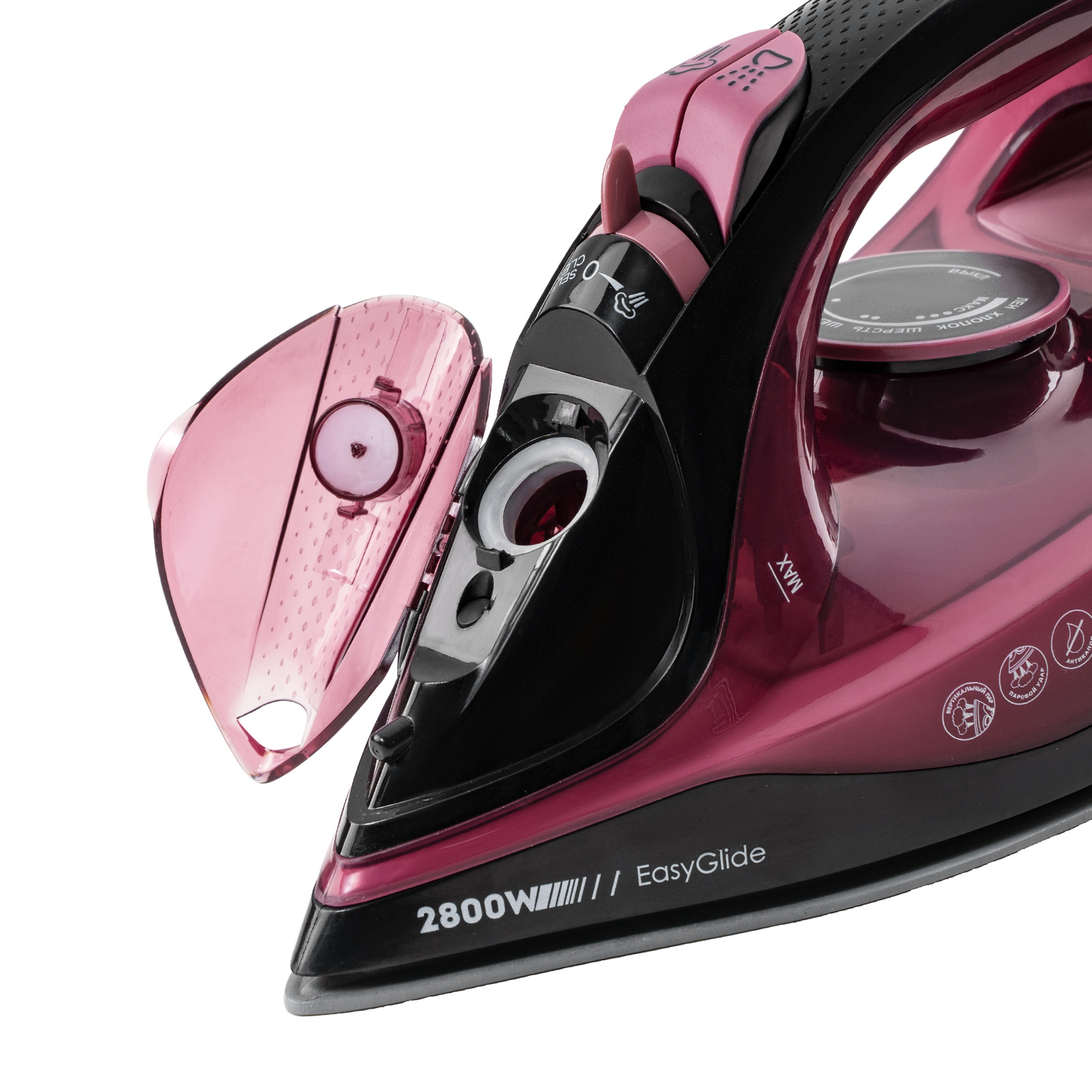 Мощность 2800 Вт обеспечивает быстрый нагрев и эффективное отглаживание и отпаривание тканей.