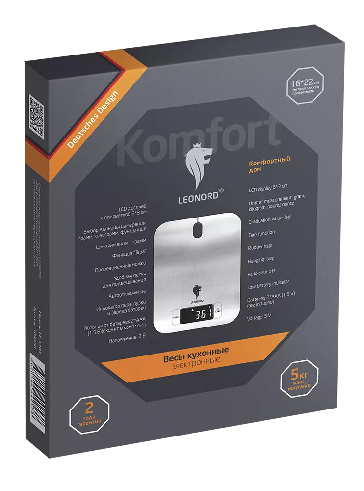Стильные кухонные весы из нержавеющей стали от Leonord отвечают всем требованиям по функциональности и взвешиванию ингредиентов от 1 грамма до 5 кг. Функция "тара" позволяет добавлять дополнительные ингредиенты, не снимая чашу с весов. Весы устойчиво стоят благодаря нескользящим ножкам, а на LCD дисплее отображаются четкие и легко читаемые цифры. Кроме того, весы автоматически отключаются, когда не используются, и следовательно, не разряжают батарею без необходимости. При желание данную модель можно подвесить, что упрощает хранение и бережет место на кухне!